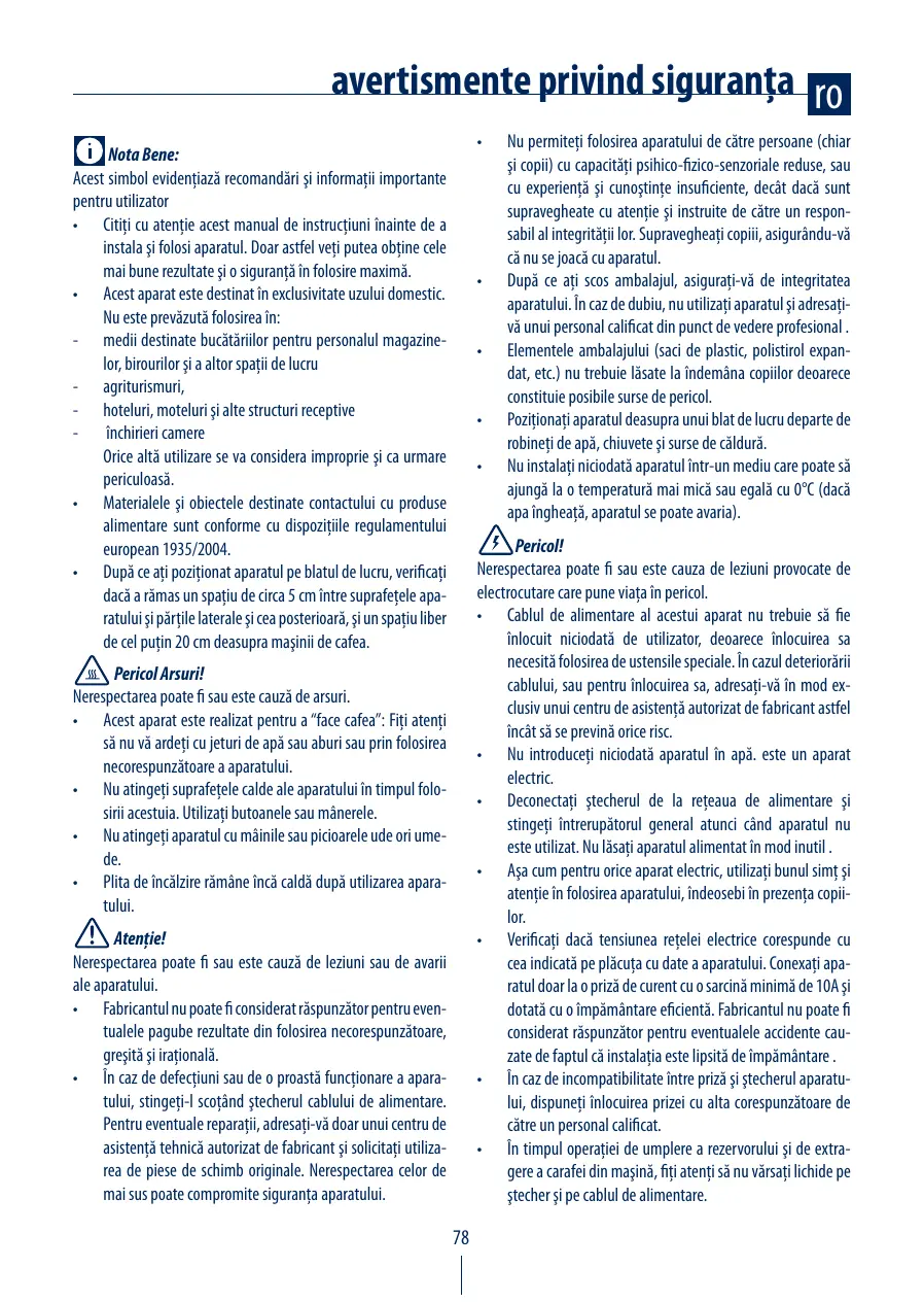 Nota Bene: Acest simbol evidenţiază recomandări şi informaţii importante pentru utilizator • Citiţi cu atenţie acest manual de instrucţiuni înainte de a instala şi folosi aparatul. Doar astfel veţi putea obţine cele mai bune rezultate şi o siguranţă în folosire maximă. • Acest aparat este destinat în exclusivitate uzului domestic. Nu este prevăzută folosirea în: - medii destinate bucătăriilor pentru personalul magazinelor, birourilor şi a altor spaţii de lucru - agriturismuri, - hoteluri, moteluri şi alte structuri receptive - închirieri camere Orice altă utilizare se va considera improprie şi ca urmare periculoasă. • Materialele şi obiectele destinate contactului cu produse alimentare sunt conforme cu dispoziţiile regulamentului european 1935/2004. • După ce aţi poziţionat aparatul pe blatul de lucru, verificaţi dacă a rămas un spaţiu de circa 5 cm între suprafeţele aparatului şi părţile laterale şi cea posterioară, şi un spaţiu liber de cel puţin 20 cm deasupra maşinii de cafea.