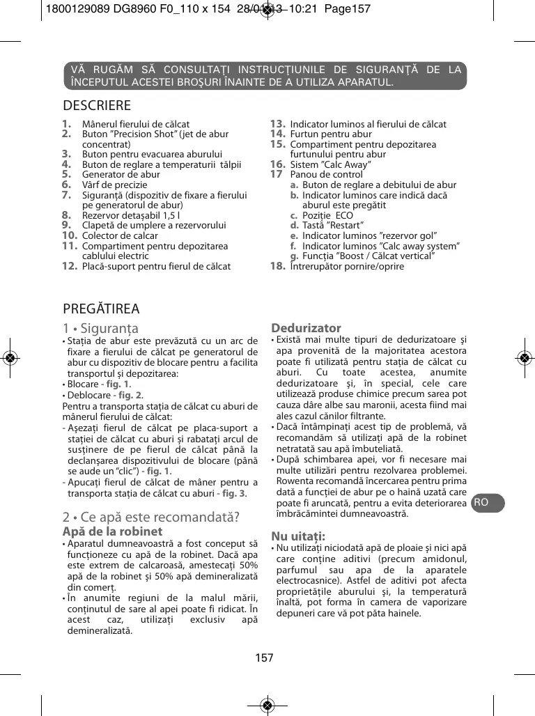Siguranță (dispozitiv de fixare a fierului pe generatorul de abur) 8. Rezervor detașabil 1,5 l 9. Clapetă de umplere a rezervorului 10. Colector de calcar 11. Compartiment pentru depozitarea cablului electric 12. Placă-suport pentru fierul de călcat