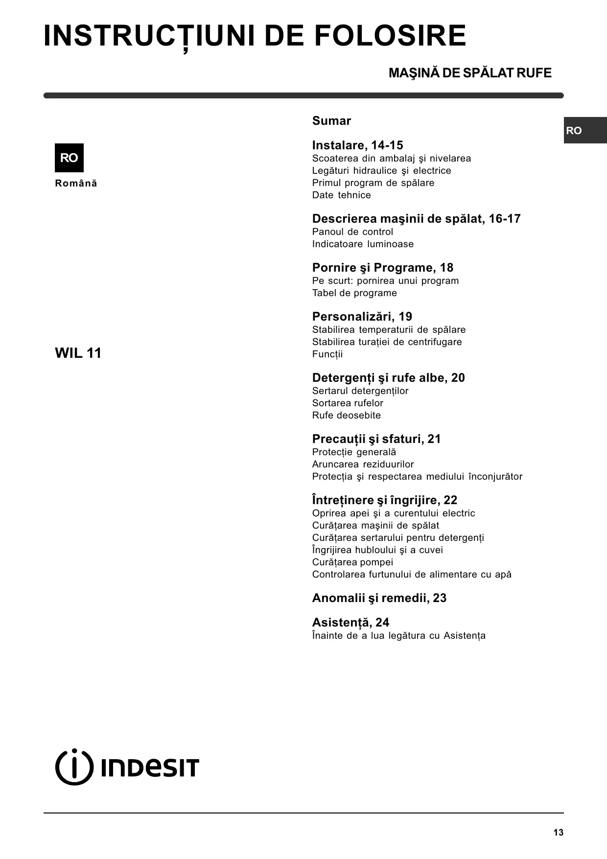 MANUAL DE UTILIZARE WIL 11 INDESIT