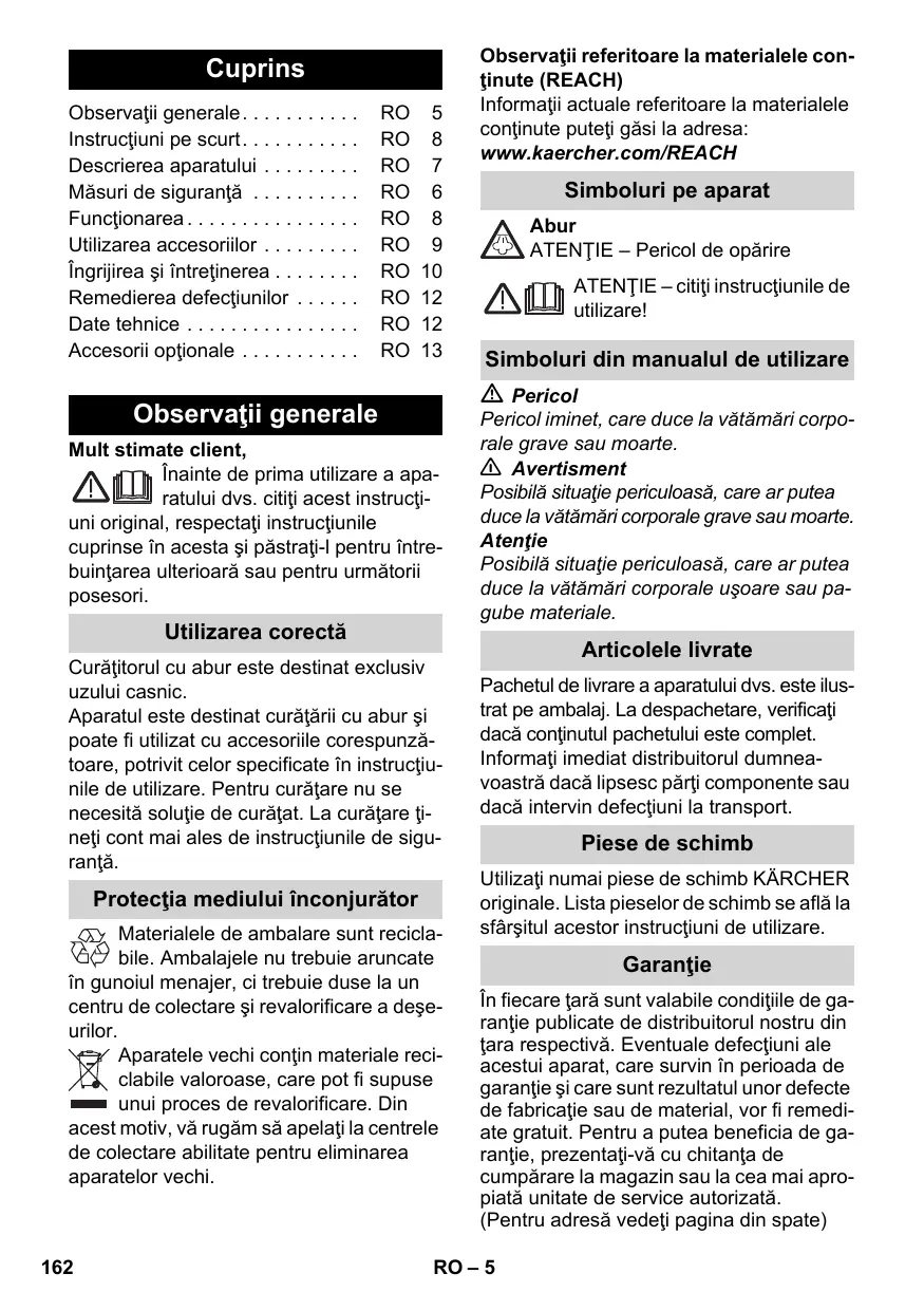 Observaţii referitoare la materialele conţinute (REACH) Informaţii actuale referitoare la materialele conţinute puteţi găsi la adresa: www.kaercher.com/REACH Pericol iminet, care duce la vătămări corporale grave sau moarte. 몇 Avertisment Posibilă situaţie periculoasă, care ar putea duce la vătămări corporale grave sau moarte. Atenţie Posibilă situaţie periculoasă, care ar putea duce la vătămări corporale uşoare sau pagube materiale. Articolele livrate Pachetul de livrare a aparatului dvs. este ilustrat pe ambalaj. La despachetare, verificaţi dacă conţinutul pachetului este complet. Informaţi imediat distribuitorul dumneavoastră dacă lipsesc părţi componente sau dacă intervin defecţiuni la transport. Piese de schimb Utilizaţi numai piese de schimb KÄRCHER originale. Lista pieselor de schimb se află la sfârşitul acestor instrucţiuni de utilizare. Garanţie În fiecare ţară sunt valabile condiţiile de garanţie publicate de distribuitorul nostru din ţara respectivă. Eventuale defecţiuni ale acestui aparat, care survin în perioada de garanţie şi care sunt rezultatul unor defecte de fabricaţie sau de material, vor fi remediate gratuit. Pentru a putea beneficia de garanţie, prezentaţi-vă cu chitanţa de cumpărare la magazin sau la cea mai apropiată unitate de service autorizată. (Pentru adresă vedeţi pagina din spate) RO – 5 Măsuri de siguranţă Pericol Este interzisă funcţionarea în zone cu pericol de explozie. La utilizarea aparatului în zone periculoase trebuie respectate normele de securitate corespunzătoare. Nu utilizaţi aparatul în bazine de înot în care se află apă. Nu este permisă folosirea aparatului pentru curăţarea aparaturii electrocasnice, ex. cuptoare, hote, cuptoare cu microunde, televizoare, lămpi, uscătoare de păr, încălzitoare electrice etc. Înainte de utilizare verificaţi aparatul şi accesoriile în privinţa stării corespunzătoare. Dacă starea nu este ireproşabilă, acestea nu pot fi utilizate. Verificaţi neapărat cablul de alimentare, închizătorul de întreţinere şi furtunul de aburi. Cablul de reţea deteriorat trebuie înlocuit neîntârziat într-un atelier electric / service pentru clienţi autorizat. Înlocuiţi imediat furtunul de aburi dacă prezintă deteriorări. Se permite numai utilizarea unui furtun pentru abur recomandat de producător (pentru numărul de comandă vezi lista de piese de schimb). Nu apucaţi niciodată fişa de alimentare şi priza având mâinile ude. Nu aplicaţi jetul de aburi pe obiecte care conţin substanţe dăunătoare sănătăţii (de ex. azbest). Nu atingeţi jetul de aburi cu mâna de la distanţă mică şi nu-l îndreptaţi asupra persoanelor sau animalelor (pericol de arsuri). Nu este permisă deschiderea închizătorului de întreţinere în timpul utilizării. 몇 Avertisment Conectarea aparatului este permisă numai la o conexiune electrică realizată conform IEC 60364, de către un electrician de specialitate. Aparatul se conectează numai la curent alternativ. Tensiunea trebuie să corespundă celei de pe plăcuţa aparatului. În încăperi cu umiditate ridicată, ca de ex. băi, utilizaţi aparatul numai conectat la prize prevăzute cu întrerupător de protecţie precomutat FI. Cablurile prelungitoare nepotrivite pot fi periculoase. Utilizaţi numai un cablu prelungitor protejat la stropirea cu apă, având un diametru minim de 3x1 mm2. Conexiunea dintre cablul de alimentare şi prelungitor nu trebuie să se afle în apă. La înlocuirea racordurilor de la cablul de alimentare sau prelungitor trebuie asigurate protecţia la stropirea cu apă şi rezistenţa mecanică. Beneficiarul are obligaţia de a utiliza aparatul conform prevederilor. El trebuie să ţină cont de împrejurările de la faţa locului şi, în timpul lucrului, să fie atent la persoanele din preajmă. Acest aparat poate fi utilizat de către copiii de peste 8 ani şi persoane cu capacităţi fizice, senzoriale sau mintale limitate sau de către persoane care nu dispun de experienţa sau cunoştinţa necesară doar atunci când sunt supravegheaţi şi au fost instruiţi în prealabil în legătură cu utilizarea sigură a aparatului şi cunosc pericolele legate de acesta. Nu lăsaţi copiii să se joace cu aparatul. Curăţarea şi întreţinerea fierului de călcat pot fi efectuate de copii doar dacă sunt nesupravegheaţi. Aparatul nu va fi lăsat să funcţioneze nesupravegheat. Atenţie la curăţarea pereţilor cu faianţă care au prize. Atenţie Atenţie la cablul de conectare sau la prelungitor, trebuie să fie în bună stare, nu îndoite, crăpate sau uzate, etc. Cablurile de reţea se vor proteja contra căldurii excesive, uleiurilor, muchiilor ascuţite. Nu introduceţi niciodată în rezervorul de apă solvenţi, lichizi cu conţinut de solvenţi sau acizi nediluaţi (de ex. agenţi de curăţare, benzină, diluant sau acetonă), deoarece acestea atacă materialele utilizate pentru construcţia aparatului. RO – 6