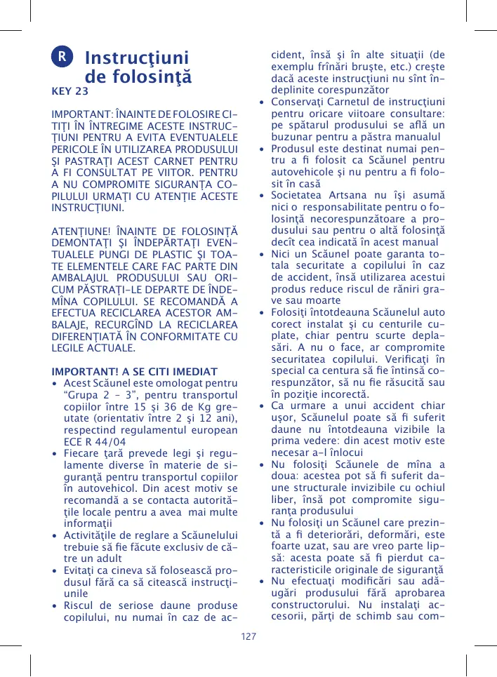 cident, însă şi în alte situaţii (de exemplu frînări bruşte, etc.) creşte dacă aceste instrucţiuni nu sînt îndeplinite corespunzător Conservaţi Carnetul de instrucţiuni pentru oricare viitoare consultare: pe spătarul produsului se află un buzunar pentru a păstra manualul Produsul este destinat numai pentru a fi folosit ca Scăunel pentru autovehicole şi nu pentru a fi folosit în casă Societatea Artsana nu îşi asumă nici o responsabilitate pentru o folosinţă necorespunzătoare a produsului sau pentru o altă folosinţă decît cea indicată în acest manual Nici un Scăunel poate garanta totala securitate a copilului în caz de accident, însă utilizarea acestui produs reduce riscul de răniri grave sau moarte Folosiţi întotdeauna Scăunelul auto corect instalat şi cu centurile cuplate, chiar pentru scurte deplasări. A nu o face, ar compromite securitatea copilului. Verificaţi în special ca centura să fie întinsă corespunzător, să nu fie răsucită sau în poziţie incorectă. Ca urmare a unui accident chiar uşor, Scăunelul poate să fi suferit daune nu întotdeauna vizibile la prima vedere: din acest motiv este necesar a-l înlocui Nu folosiţi Scăunele de mîna a doua: acestea pot să fi suferit daune structurale invizibile cu ochiul liber, însă pot compromite siguranţa produsului Nu folosiţi un Scăunel care prezintă a fi deteriorări, deformări, este foarte uzat, sau are vreo parte lipsă: acesta poate să fi pierdut caracteristicile originale de siguranţă Nu efectuaţi modificări sau adăugări produsului fără aprobarea constructorului. Nu instalaţi accesorii, părţi de schimb sau com-