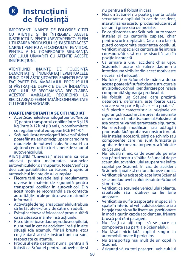 • No permita que nadie utilice el producto sin haber leído las instrucciones. • Si no se siguen exactamente las instrucciones de este manual aumenta el riesgo de daños graves para el niño, no sólo en caso de accidente sino también en otras situaciones (por ej. frenadas bruscas, etc.). • Este producto debe ser utilizado exclusivamente como sillita de automóvil; no utili28