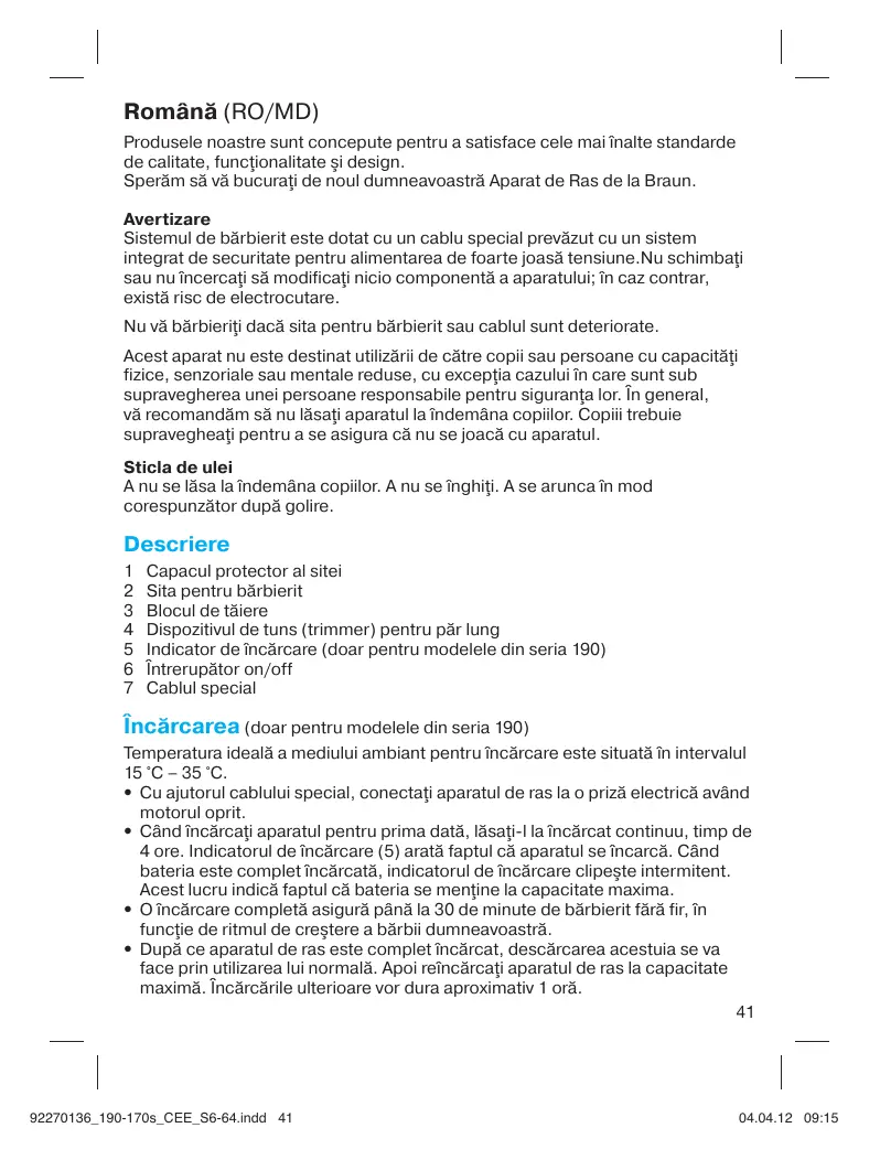 Română (RO/MD) Produsele noastre sunt concepute pentru a satisface cele mai înalte standarde de calitate, funcţionalitate şi design. Sperăm să vă bucuraţi de noul dumneavoastră Aparat de Ras de la Braun. Avertizare Sistemul de bărbierit este dotat cu un cablu special prevăzut cu un sistem integrat de securitate pentru alimentarea de foarte joasă tensiune.Nu schimbaţi sau nu încercaţi să modificaţi nicio componentă a aparatului; în caz contrar, există risc de electrocutare. Nu vă bărbieriţi dacă sita pentru bărbierit sau cablul sunt deteriorate. Acest aparat nu este destinat utilizării de către copii sau persoane cu capacităţi fizice, senzoriale sau mentale reduse, cu excepţia cazului în care sunt sub supravegherea unei persoane responsabile pentru siguranţa lor. În general, vă recomandăm să nu lăsaţi aparatul la îndemâna copiilor. Copiii trebuie supravegheaţi pentru a se asigura că nu se joacă cu aparatul. Sticla de ulei A nu se lăsa la îndemâna copiilor. A nu se înghiţi. A se arunca în mod corespunzător după golire. Descriere
