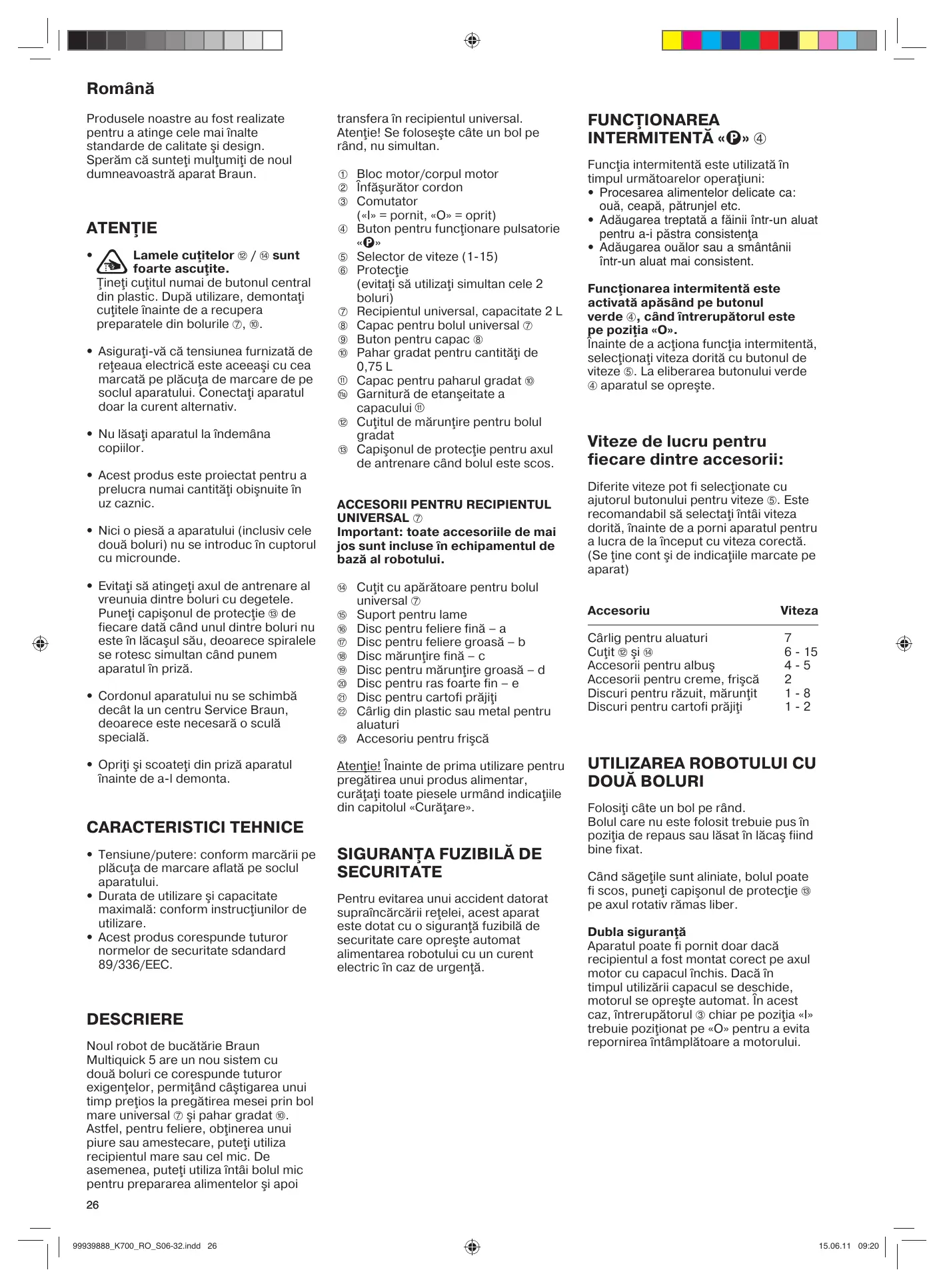 UNIVERSAL 7 Important: toate accesoriile de mai jos sunt incluse în echipamentul de bază al robotului. n Cuţit cu apărătoare pentru bolul universal 7 o Suport pentru lame p Disc pentru feliere fină – a q Disc pentru feliere groasă – b r Disc mărunţire fină – c s Disc pentru mărunţire groasă – d t Disc pentru ras foarte fin – e u Disc pentru cartofi prăjiţi v Cârlig din plastic sau metal pentru aluaturi w Accesoriu pentru frişcă Atenţie! Înainte de prima utilizare pentru pregătirea unui produs alimentar, curăţaţi toate piesele urmând indicaţiile din capitolul «Curăţare». CARACTERISTICI TEHNICE