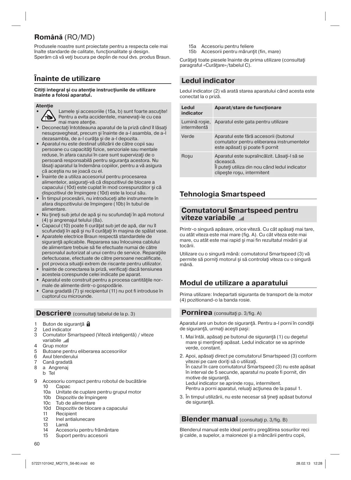 Română (RO/MD) Produsele noastre sunt proiectate pentru a respecta cele mai înalte standarde de calitate, funcţionalitate şi design. Sperăm că vă veţi bucura pe deplin de noul dvs. produs Braun. Înainte de utilizare Citiţi integral şi cu atenţie instrucţiunile de utilizare înainte a folosi aparatul. 15a 15b Accesoriu pentru feliere Accesorii pentru mărunţit (fin, mare) Curăţaţi toate piesele înainte de prima utilizare (consultaţi paragraful «Curăţare»/tabelul C). Ledul indicator Ledul indicator (2) vă arată starea aparatului când acesta este conectat la o priză. Atenţie