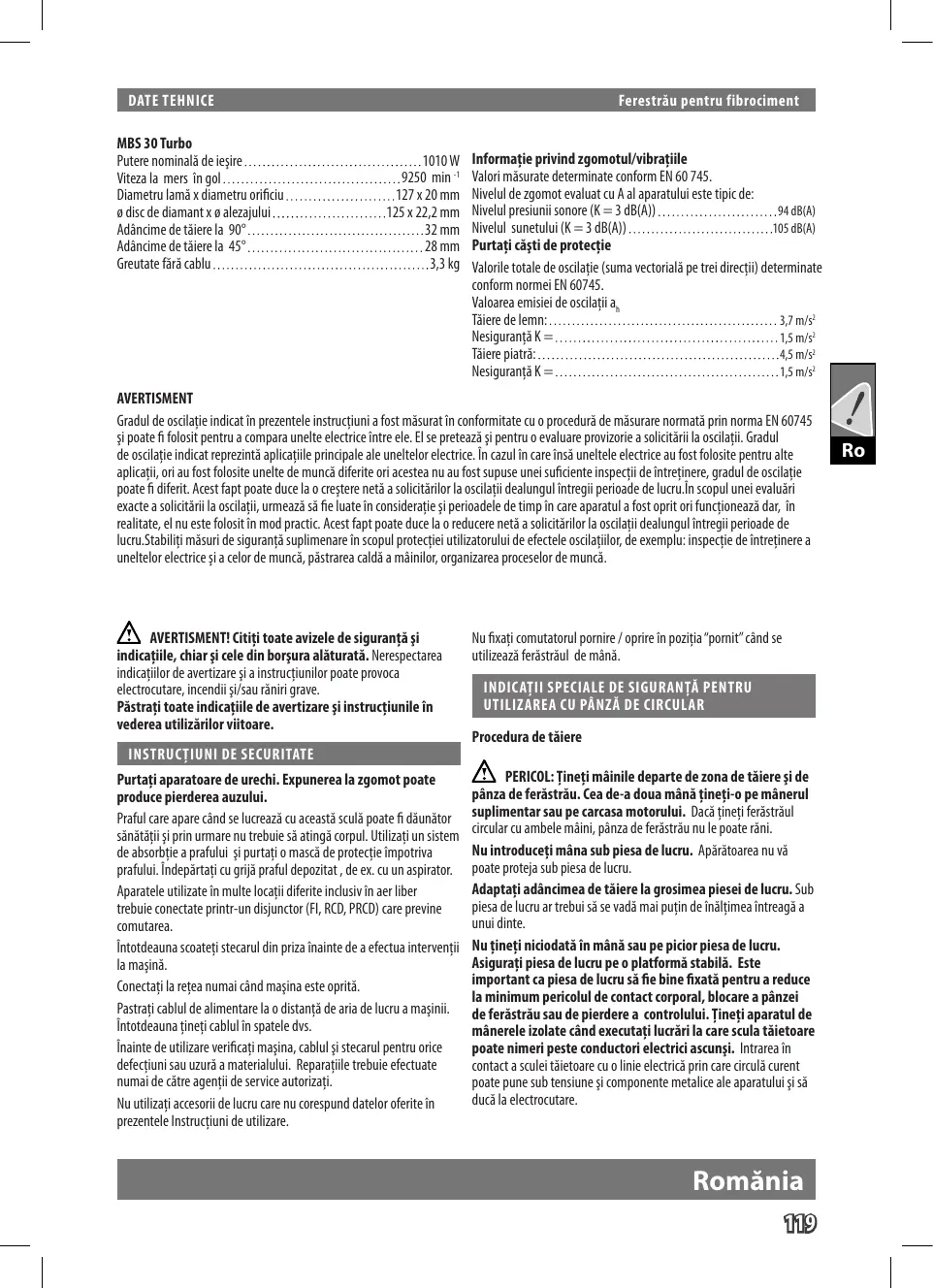 Fierästräul pentru fbrociment se utilizeazä pentru täierea in sectiune dreaptä alemnulu,pietr), fibrocimentului cu ajutorul discului circular precum i pentru tälerea pietri cu ajutorul discului diamantat. Nuutilizati acest produs in alt mod decêt cel stabilit pentru utilizare normalé