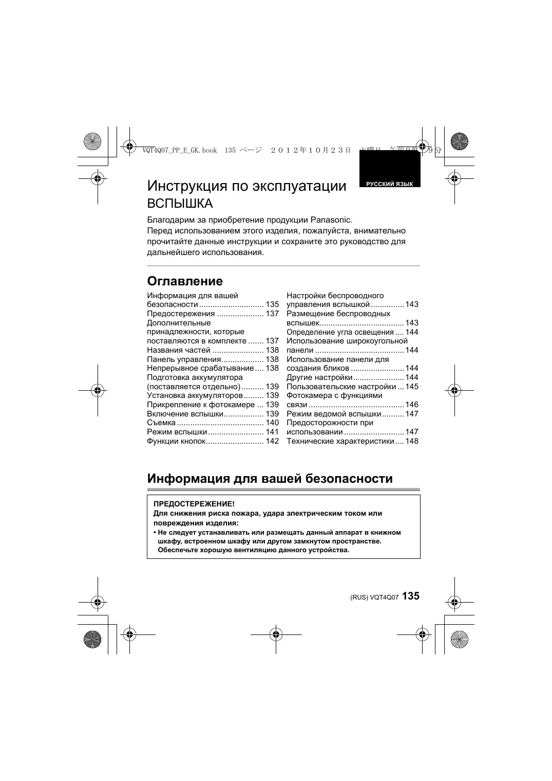 Непрерывное срабатывание Вспышка может сильно нагреваться при срабатывании много раз подряд, что может привести к повреждению или неисправности. Вспышка должна срабатывать не более 10 раз подряд с интервалом в 2,5 секунды, после чего ее нельзя использовать как минимум 10 минут. 138 VQT4Q07 (RUS) VQT4Q07_PP_E_GK.book 139 ページ 2012年10月23日
