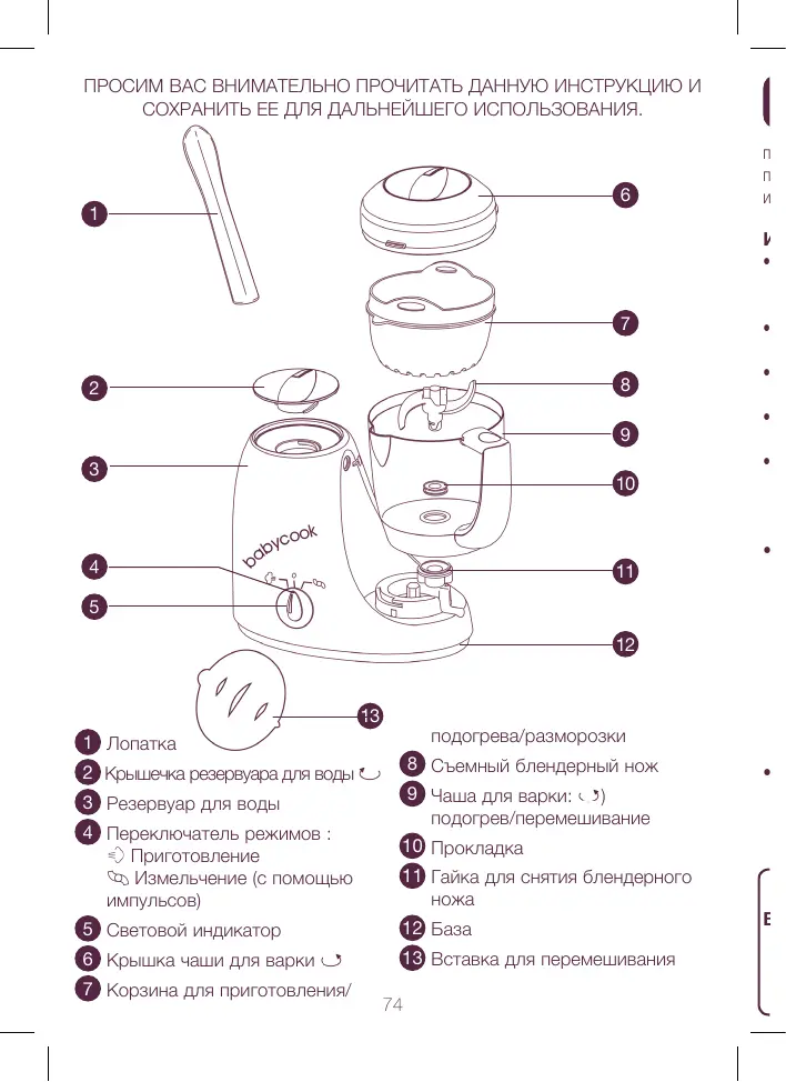 Благодарим Вас за покупку и поздравляем с приобретением прибора с уникальными техническими возможностями. Пароварка BABYCOOK была специально разработана для быстрого и легкого приготовления здоровой пищи для вашего малыша. Пароварка BABYCOOK готовит, подогревает и размораживает продукты питания на пару, позволяет обеспечить их полное измельчение, сохраняя максимальное количество витаминов и питательных веществ. ИНСТРУКЦИЯ ПО ПРИМИНЕНИЮ • Ваша новая пароварка состоит из электрического основания, включающего резервуар для воды с крышкой, а также съемной чаши для варки с крышкой, в которую вставляется паровая корзина, блендерный нож и вставка для измельчения. • Для того, чтобы зафиксировать крышку резервуара для воды, поверните ее по часовой стрелке . • Для того, чтобы зафиксировать крышку съемной чаши для варки, поверните ее против часовой стрелки . • Чтобы вынуть паровую корзину, используйте лопатку, продев ее в ручки паровой корзины. • Соблюдайте осторожность при обращении с блендерным ножом, обладающим очень острым лезвием. Для предотвращения ожогов, будьте внимательны при снятии крышки, извлечении чаши для варки и других деталей сразу же после окончания работы прибора, т.к. вода конденсата чрезвычайно горячая. • В начале использования, пока ваш прибор еще новый, процесс фиксации может быть затруднен. Убедитесь в том, что чаша для варки закреплена, повернув CLIC ее против часовой стрелки до щелчка, в данном случае прибор зафиксирован. Пароварка оснащена системой защиты. Если чаша для варки не до конца CLIC зафиксирована, система защиты автоматически помешает включению прибора. • Перед использованием прибора в первый раз, в целях гигиены, запустите 3 цикла «приготовление на пару» ( залейте чистую воду до уровеня 3), следуя ниже указанным инструкциям. Затем тщательно вымойте чашу и все детали теплой мыльной водой.