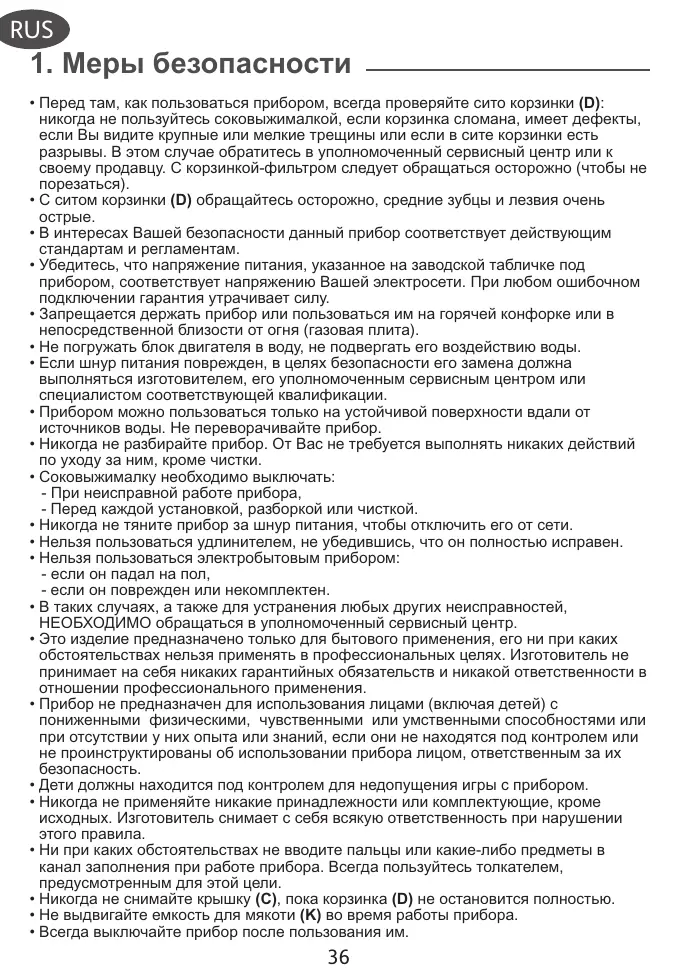 1. Меры безопасности • Перед там, как пользоваться прибором, всегда проверяйте сито корзинки (D): никогда не пользуйтесь соковыжималкой, если корзинка сломана, имеет дефекты, если Вы видите крупные или мелкие трещины или если в сите корзинки есть разрывы. В этом случае обратитесь в уполномоченный сервисный центр или к своему продавцу. С корзинкой-фильтром следует обращаться осторожно (чтобы не порезаться). • С ситом корзинки (D) обращайтесь осторожно, средние зубцы и лезвия очень острые. • В интересах Вашей безопасности данный прибор соответствует действующим стандартам и регламентам. • Убедитесь, что напряжение питания, указанное на заводской табличке под прибором, соответствует напряжению Вашей электросети. При любом ошибочном подключении гарантия утрачивает силу. • Запрещается держать прибор или пользоваться им на горячей конфорке или в непосредственной близости от огня (газовая плита). • Не погружать блок двигателя в воду, не подвергать его воздействию воды. • Если шнур питания поврежден, в целях безопасности его замена должна выполняться изготовителем, его уполномоченным сервисным центром или специалистом соответствующей квалификации. • Прибором можно пользоваться только на устойчивой поверхности вдали от источников воды. Не переворачивайте прибор. • Никогда не разбирайте прибор. От Вас не требуется выполнять никаких действий по уходу за ним, кроме чистки. • Соковыжималку необходимо выключать: - При неисправной работе прибора, - Перед каждой установкой, разборкой или чисткой. • Никогда не тяните прибор за шнур питания, чтобы отключить его от сети. • Нельзя пользоваться удлинителем, не убедившись, что он полностью исправен. • Нельзя пользоваться электробытовым прибором: - если он падал на пол, - если он поврежден или некомплектен. • В таких случаях, а также для устранения любых других неисправностей, НЕОБХОДИМО обращаться в уполномоченный сервисный центр. • Это изделие предназначено только для бытового применения, его ни при каких обстоятельствах нельзя применять в профессиональных целях. Изготовитель не принимает на себя никаких гарантийных обязательств и никакой ответственности в отношении профессионального применения. • Прибор не предназначен для использования лицами (включая детей) с пониженными физическими, чувственными или умственными способностями или при отсутствии у них опыта или знаний, если они не находятся под контролем или не проинструктированы об использовании прибора лицом, ответственным за их безопасность. • Дети должны находится под контролем для недопущения игры с прибором. • Никогда не применяйте никакие принадлежности или комплектующие, кроме исходных. Изготовитель снимает с себя всякую ответственность при нарушении этого правила. • Ни при каких обстоятельствах не вводите пальцы или какие-либо предметы в канал заполнения при работе прибора. Всегда пользуйтесь толкателем, предусмотренным для этой цели. • Никогда не снимайте крышку (С), пока корзинка (D) не остановится полностью. • Не выдвигайте емкость для мякоти (K) во время работы прибора. • Всегда выключайте прибор после пользования им.