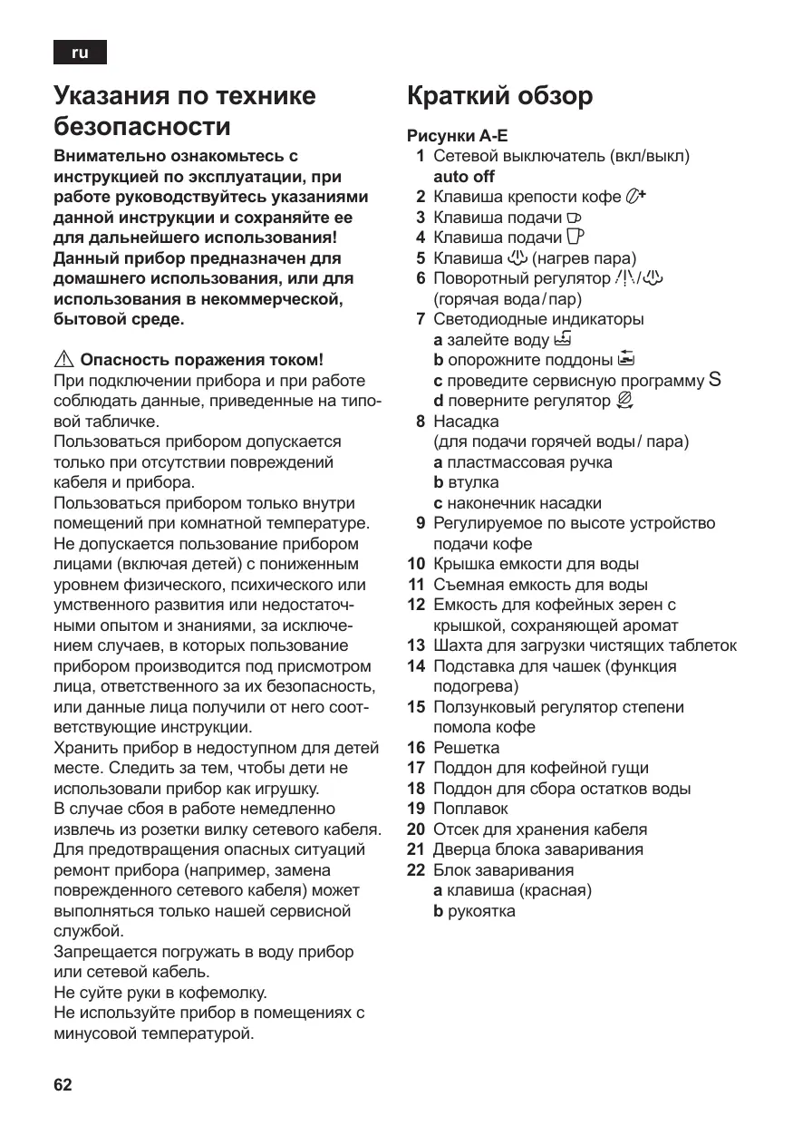 Figures A-E 13 Trémie pour pastilles de nettoyage 14 Plateau chauffe-tasses 15 Curseur de finesse de mouture du café 16 Grille 17 Tiroir à café 18 Bac collecteur d’eau 19 Flotteur 20 Logement pour le cordon électrique 21 Volet de la chambre de percolation 22 Chambre de percolation a Bouton-poussoir (rouge) b Poignée