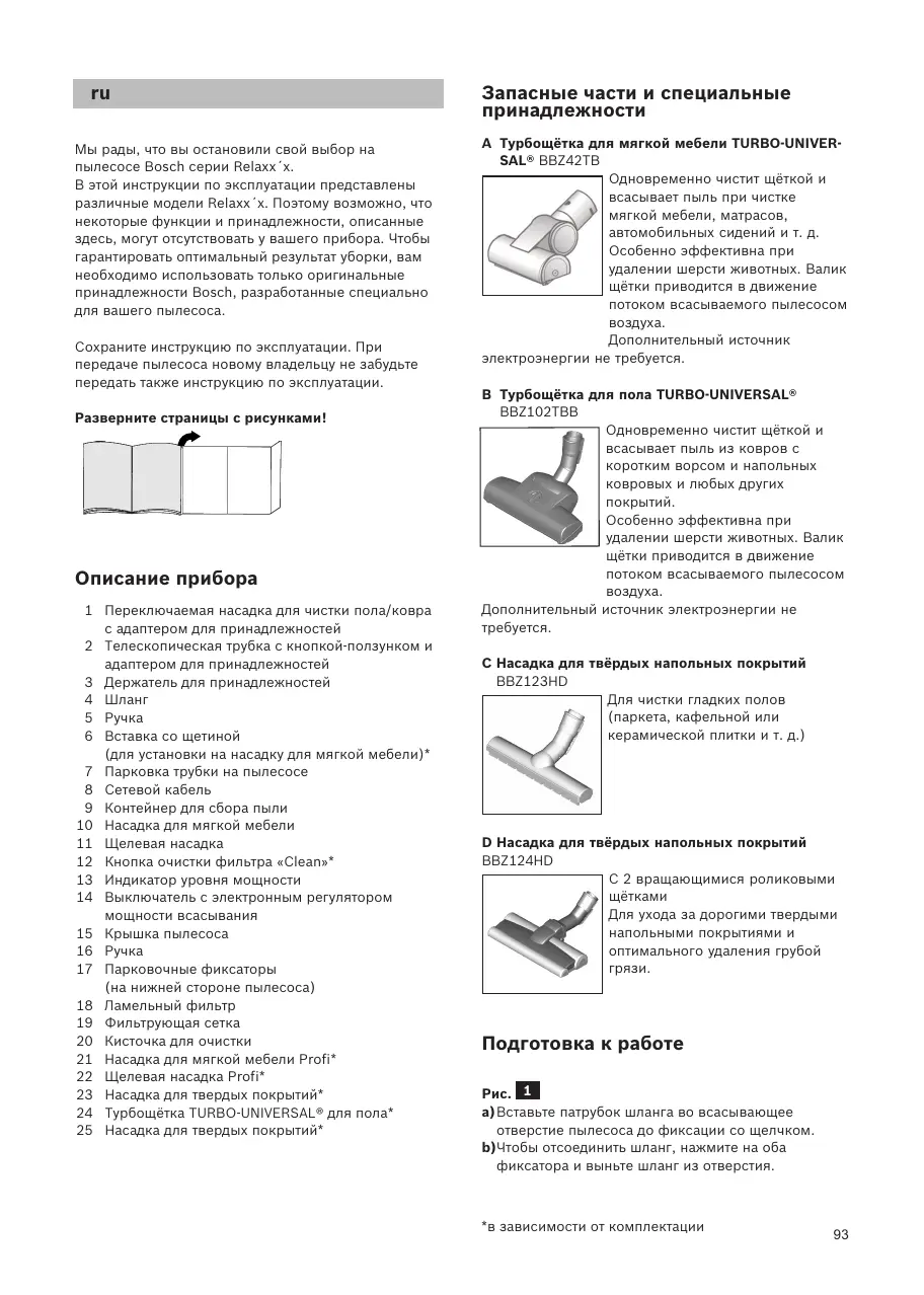 Congratulations on your purchase of the Bosch Relaxx´x vacuum cleaner. This instruction manual describes various Relaxx´x models, which means that some of the equipment features and functions described may not apply to your model. You should only use original Bosch accessories, which have been specially developed for your vacuum cleaner, to achieve the best possible vacuuming results. Please keep this instruction manual for future reference. If you pass the vacuum cleaner on to someone else, please also pass on this instruction manual. Fold out the picture pages. de