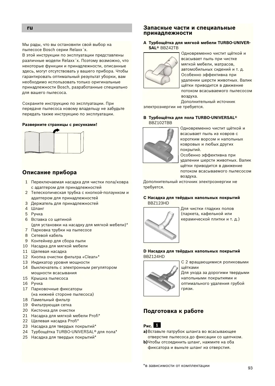 Мы рады, что вы остановили свой выбор на пылесосе Bosch серии Relaxx´x. В этой инструкции по эксплуатации представлены различные модели Relaxx´x. Поэтому возможно, что некоторые функции и принадлежности, описанные здесь, могут отсутствовать у вашего прибора. Чтобы гарантировать оптимальный результат уборки, вам необходимо использовать только оригинальные принадлежности Bosch, разработанные специально для вашего пылесоса. Сохраните инструкцию по эксплуатации. При передаче пылесоса новому владельцу не забудьте передать также инструкцию по эксплуатации. Разверните страницы с рисунками! Описание прибора 1 Переключаемая насадка для чистки пола/ковра с адаптером для принадлежностей 2 Телескопическая трубка с кнопкой-ползунком и адаптером для принадлежностей 3 Держатель для принадлежностей 4 Шланг 5 Ручка 6 Вставка со щетиной (для установки на насадку для мягкой мебели)* 7 Парковка трубки на пылесосе 8 Сетевой кабель 9 Контейнер для сбора пыли 10 Насадка для мягкой мебели 11 Щелевая насадка 12 Кнопка очистки фильтра «Clean»* 13 Индикатор уровня мощности 14 Выключатель с электронным регулятором мощности всасывания 15 Крышка пылесоса 16 Ручка 17 Парковочные фиксаторы (на нижней стороне пылесоса) 18 Ламельный фильтр 19 Фильтрующая сетка 20 Кисточка для очистки 21 Насадка для мягкой мебели Profi* 22 Щелевая насадка Profi* 23 Насадка для твердых покрытий* 24 Турбощётка TURBO-UNIVERSAL® для пола* 25 Насадка для твердых покрытий* Запасные части и специальные принадлежности A Турбощётка для мягкой мебели TURBO-UNIVERSAL® BBZ42TB Одновременно чистит щёткой и всасывает пыль при чистке мягкой мебели, матрасов, автомобильных сидений и т. д. Особенно эффективна при удалении шерсти животных. Валик щётки приводится в движение потоком всасываемого пылесосом Дополнительный источник электроэнергии не требуется. B Турбощётка для пола TURBO-UNIVERSAL® BBZ102TBB Одновременно чистит щёткой и всасывает пыль из ковров с коротким ворсом и напольных ковровых и любых других Особенно эффективна при удалении шерсти животных. Валик щётки приводится в движение потоком всасываемого пылесосом Дополнительный источник электроэнергии не C Насадка для твёрдых напольных покрытий BBZ123HD Для чистки гладких полов (паркета, кафельной или керамической плитки и т. д.) D Насадка для твёрдых напольных покрытий BBZ124HD С 2 вращающимися роликовыми Для ухода за дорогими твердыми напольными покрытиями и оптимального удаления грубой