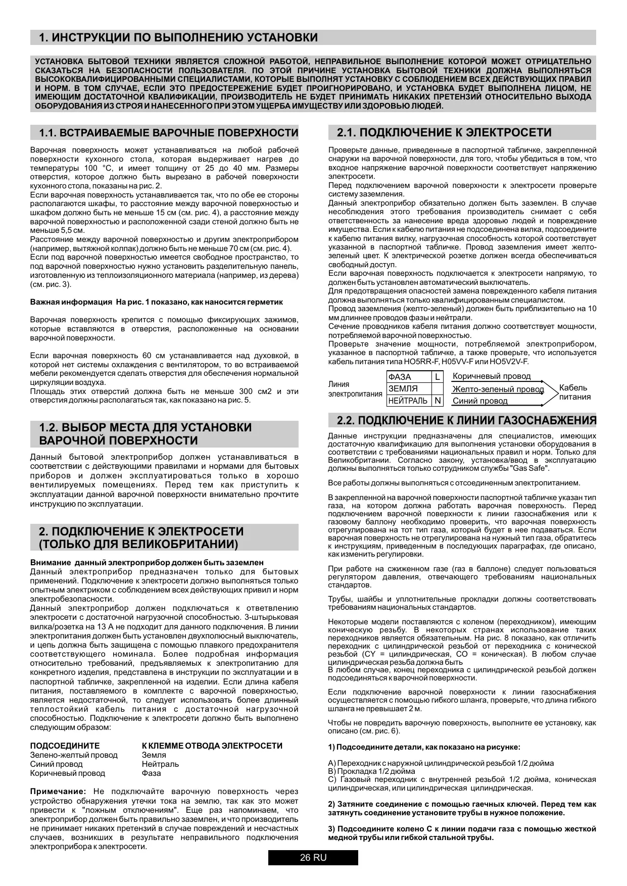 2.2. ПОДКЛЮЧЕНИЕ К ЛИНИИ ГАЗОСНАБЖЕНИЯ 1.2. ВЫБОР МЕСТА ДЛЯ УСТАНОВКИ ВАРОЧНОЙ ПОВЕРХНОСТИ Данные инструкции предназначены для специалистов, имеющих достаточную квалификацию для выполнения установки оборудования в соответствии с требованиями национальных правил и норм. Только для Великобритании. Согласно закону, установка/ввод в эксплуатацию должны выполняться только сотрудником службы "Gas Safe". Данный бытовой электроприбор должен устанавливаться в соответствии с действующими правилами и нормами для бытовых приборов и должен эксплуатироваться только в хорошо вентилируемых помещениях. Перед тем как приступить к эксплуатации данной варочной поверхности внимательно прочтите инструкцию по эксплуатации. Все работы должны выполняться с отсоединенным электропитанием. В закрепленной на варочной поверхности паспортной табличке указан тип газа, на котором должна работать варочная поверхность. Перед подключением варочной поверхности к линии газоснабжения или к газовому баллону необходимо проверить, что варочная поверхность отрегулирована на тот тип газа, который будет в нее подаваться. Если варочная поверхность не отрегулирована на нужный тип газа, обратитесь к инструкциям, приведенным в последующих параграфах, где описано, как изменить регулировки.