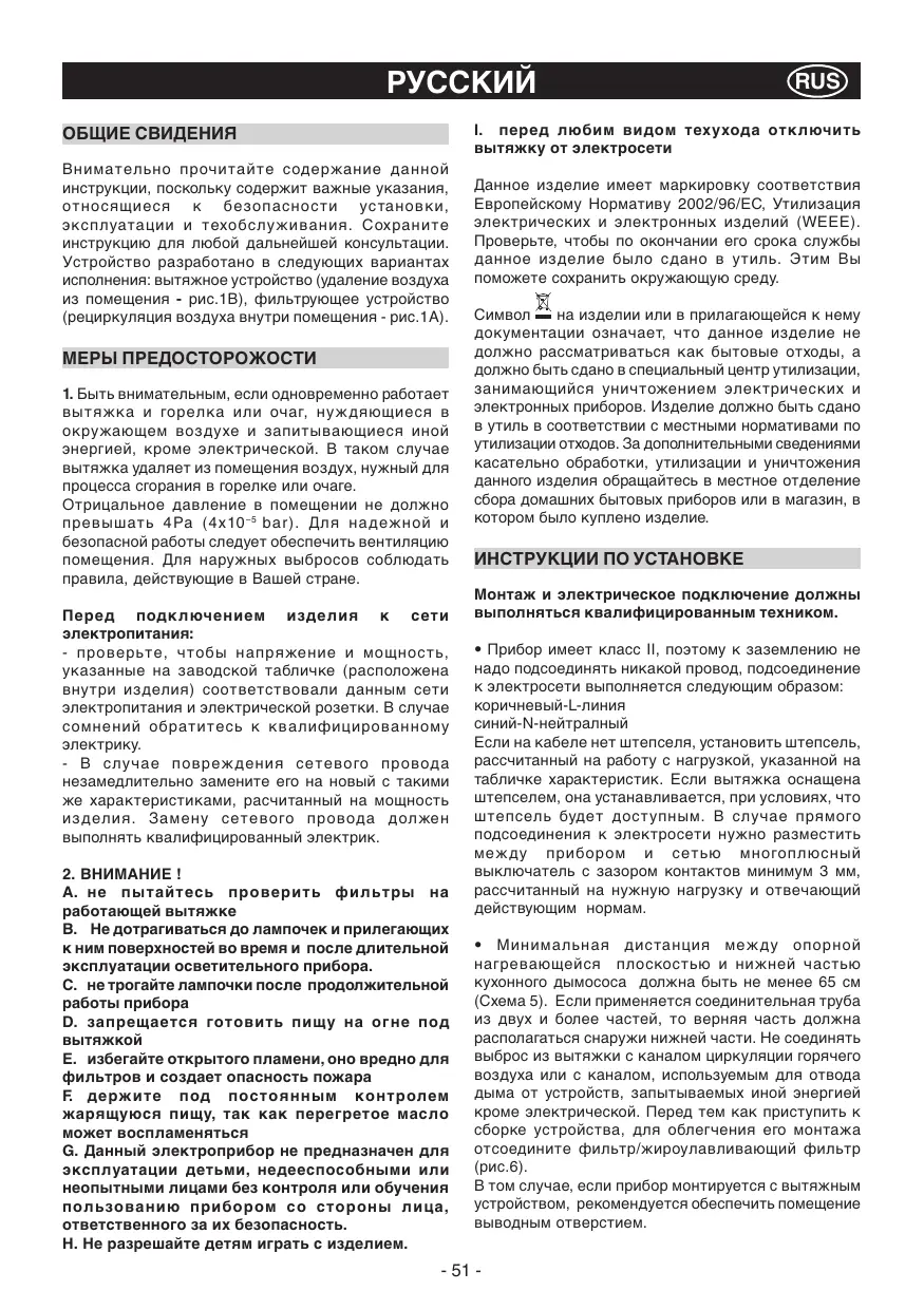 A. не пытайтесь проверить фильтры на работающей вытяжке B. Не дотрагиваться до лампочек и прилегающих к ним поверхностей во время и после длительной эксплуатации осветительного прибора. C. не трогайте лампочки после продолжительной работы прибора D. запрещается готовить пищу на огне под E. избегайте открытого пламени, оно вредно для фильтров и создает опасность пожара F. держите под постоянным контролем жарящуюся пищу, так как перегретое масло может воспламеняться G. Данный электроприбор не предназначен для эксплуатации детьми, недееспособными или неопытными лицами без контроля или обучения пользованию прибором со стороны лица, ответственного за их безопасность. H. Не разрешайте детям играть с изделием. Данное изделие имеет маркировку соответствия Европейскому Нормативу 2002/96/ЕС, Утилизация электрических и электронных изделий (WEEE). Проверьте, чтобы по окончании его срока службы данное изделие было сдано в утиль. Этим Вы поможете сохранить окружающую среду. на изделии или в прилагающейся к нему документации означает, что данное изделие не должно рассматриваться как бытовые отходы, а должно быть сдано в специальный центр утилизации, занимающийся уничтожением электрических и электронных приборов. Изделие должно быть сдано в утиль в соответствии с местными нормативами по утилизации отходов. За дополнительными сведениями касательно обработки, утилизации и уничтожения данного изделия обращайтесь в местное отделение сбора домашних бытовых приборов или в магазин, в котором было куплено изделие. ИНСТРУКЦИИ ПО УСТАНОВКЕ Монтаж и электрическое подключение должны выполняться квалифицированным техником.