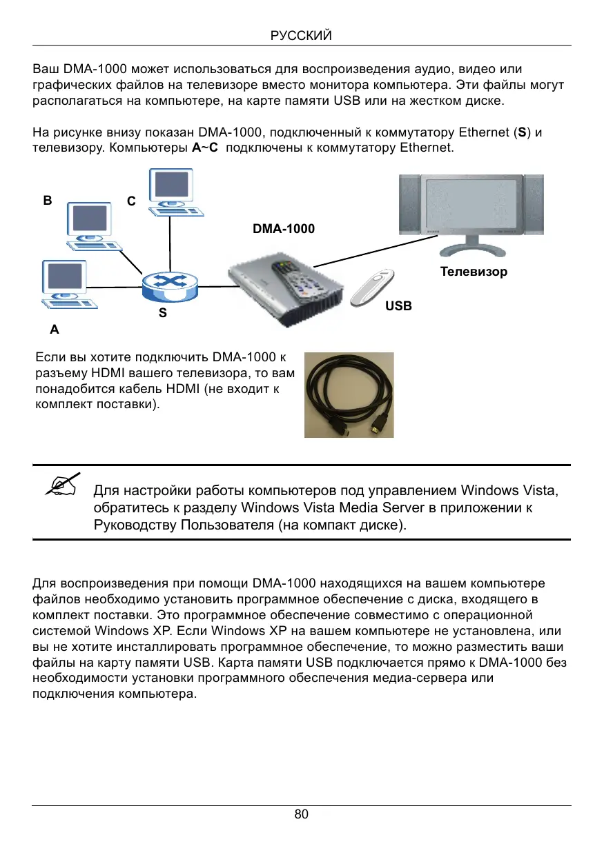 Ваш DMA-1000 может использоваться для воспроизведения аудио, видео или графических файлов на телевизоре вместо монитора компьютера. Эти файлы могут располагаться на компьютере, на карте памяти USB или на жестком диске. На рисунке внизу показан DMA-1000, подключенный к коммутатору Ethernet (S) и телевизору. Компьютеры A~C подключены к коммутатору Ethernet.