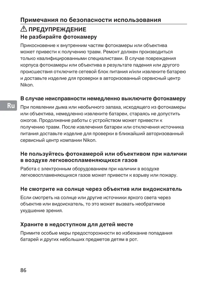 ПРЕДУПРЕЖДЕНИЕ Не разбирайте фотокамеру Прикосновение к внутренним частям фотокамеры или объектива может привести к получению травм. Ремонт должен производиться только квалифицированными специалистами. В случае повреждения корпуса фотокамеры или объектива в результате падения или другого происшествия отключите сетевой блок питания и/или извлеките батарею и доставьте изделие для проверки в авторизованный сервисный центр Nikon. В случае неисправности немедленно выключите фотокамеру При появлении дыма или необычного запаха, исходящего из фотокамеры или объектива, немедленно извлеките батареи, стараясь не допустить ожогов. Продолжение работы с устройством может привести к получению травм. После извлечения батареи или отключения источника питания доставьте изделие для проверки в ближайший авторизованный сервисный центр компании Nikon.