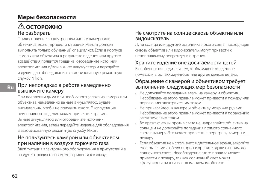 Ru При неполадках в работе немедленно выключите камеру При появлении дыма или необычного запаха из камеры или объектива немедленно выньте аккумулятор. Будьте внимательны, чтобы не получить ожоги. Эксплуатация неисправного изделия может привести к травме. Выньте аккумулятор или отсоедините источник электропитания, затем передайте изделие для обследования в авторизованную ремонтную службу Nikon.