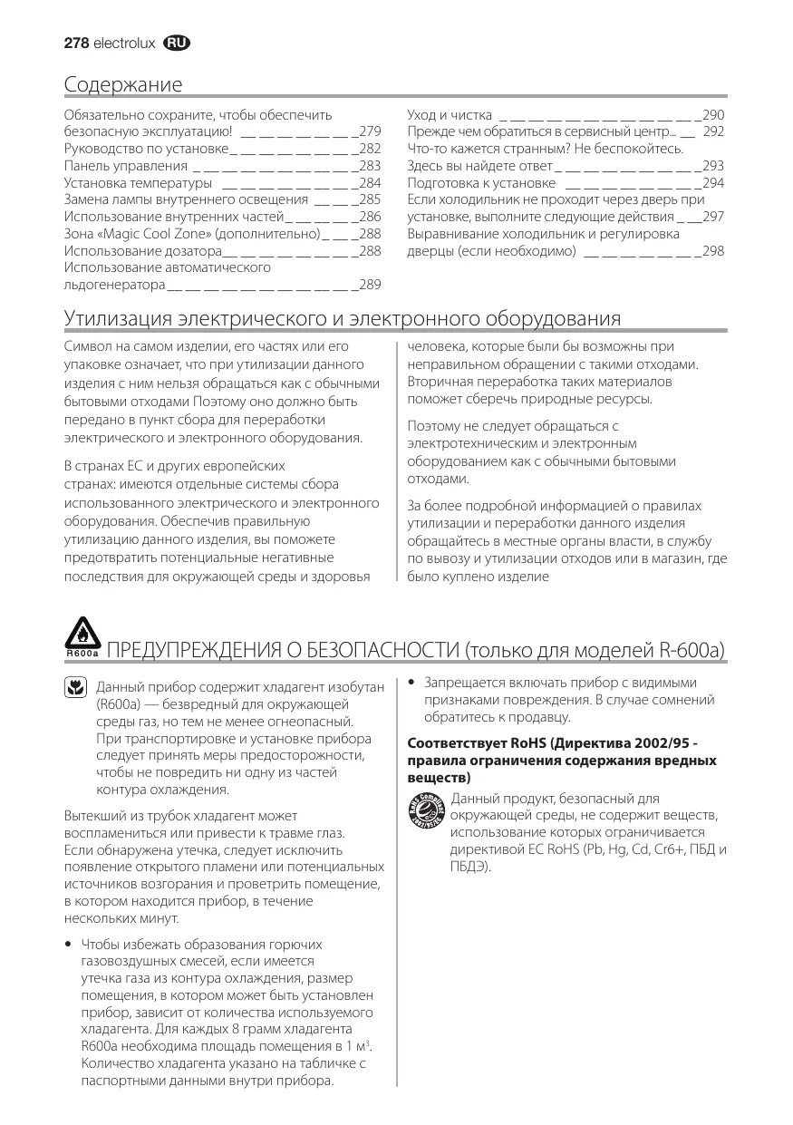 Обязательно сохраните, чтобы обеспечить безопасную эксплуатацию! _ __ __ __ __ __ __ 279 Руководство по установке_ __ __ __ __ __ __ __282 Панель управления_ __ __ __ __ __ __ __ __ __283 Установка температуры _ __ __ __ __ __ __ __ 284 Замена лампы внутреннего освещения _ __ __ 285 Использование внутренних частей_ __ __ __ __286 Зона «Magic Cool Zone» (дополнительно)_ __ __288 Использование дозатора_ __ __ __ __ __ __ __288 Использование автоматического льдогенератора _ __ __ __ __ __ __ __ __ __ __289 Уход и чистка_ __ __ __ __ __ __ __ __ __ __ __290 Прежде чем обратиться в сервисный центр..._ __ 292 Что-то кажется странным? Не беспокойтесь. Здесь вы найдете ответ_ __ __ __ __ __ __ __ __293 Подготовка к установке _ __ __ __ __ __ __ __ 294 Если холодильник не проходит через дверь при установке, выполните следующие действия_ __ 297 Выравнивание холодильник и регулировка дверцы (если необходимо) _ __ __ __ __ __ __ 298 Утилизация электрического и электронного оборудования Символ на самом изделии, его частях или его упаковке означает, что при утилизации данного изделия с ним нельзя обращаться как с обычными бытовыми отходами Поэтому оно должно быть передано в пункт сбора для переработки электрического и электронного оборудования. В странах ЕС и других европейских странах: имеются отдельные системы сбора использованного электрического и электронного оборудования. Обеспечив правильную утилизацию данного изделия, вы поможете предотвратить потенциальные негативные последствия для окружающей среды и здоровья человека, которые были бы возможны при неправильном обращении с такими отходами. Вторичная переработка таких материалов поможет сберечь природные ресурсы. Поэтому не следует обращаться с электротехническим и электронным оборудованием как с обычными бытовыми За более подробной информацией о правилах утилизации и переработки данного изделия обращайтесь в местные органы власти, в службу по вывозу и утилизации отходов или в магазин, где было куплено изделие ПРЕДУПРЕЖДЕНИЯ О БЕЗОПАСНОСТИ (только для моделей R-600a) Данный прибор содержит хладагент изобутан (R600a) — безвредный для окружающей среды газ, но тем не менее огнеопасный. При транспортировке и установке прибора следует принять меры предосторожности, чтобы не повредить ни одну из частей контура охлаждения. Вытекший из трубок хладагент может воспламениться или привести к травме глаз. Если обнаружена утечка, следует исключить появление открытого пламени или потенциальных источников возгорания и проветрить помещение, в котором находится прибор, в течение нескольких минут.