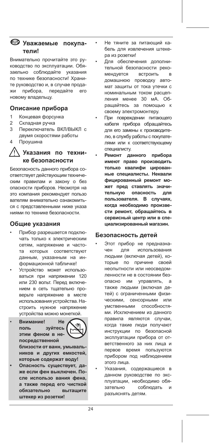 Детя м за прещ ено пользова ться ф еном без присм отра ! Не ра зреша йте д етя м игра ть сустройством . Упа ковочные ма териа лы, на при м ер, полиэтиленовые па кеты, не д олжны попа д а ть д етя м в руки. Что нужно зна ть при пользова нии Если прибор упа л в вод у, нем ед ленно вытя ните штекер из розетки. Ни в коем случа е не лезьте в вод у! Отд а йте прибор на проверку ква лиф ицирова нном у специа листу! П рибор нельзя м очить или пользова ться им м окрым и рука м и. Не брызга йте на прибор из пульвериза тора или д ругого вод ора спылителя . П ока прибор ра бота ет, не пользуй тесь ра спылителем ла ка д ля волос. Если вы на врем я выпуска ете прибор из рук, то по сообра ж ения м безопа сности его реком енд уется выклю чить. П реж д е чем после использова ния кла сть прибор на хра нение, д а йте ем у остыть. Не на м а тыва йте пита ю щ ий ка бель вокругприбора . Выпускна я решетка в процессе эксплуа та ции на грева ется ! За прещ а ется за крыва ть впускные и выпускные возд ушные отверстия . В случа е за гря знения решетку воз д ухоза борника необход им о почис тить. Волосы не д олж ны попа д а ть в решетку возд ухоза борника . Если в процессе эксплуа та ции блокируется проход возд уха (на прим ер, за гря знения ), то встроенный м еха низм за щ иты от перегрева а втом а тически выклю ча ет прибор, а после охла ж д ения (через несколько м инут) снова его вклю ча ет. П ита ю щ ий ка бель в процессе пользова ния прибором не д олж ен прика са ться к выпускном у возд ушном у отверстию .