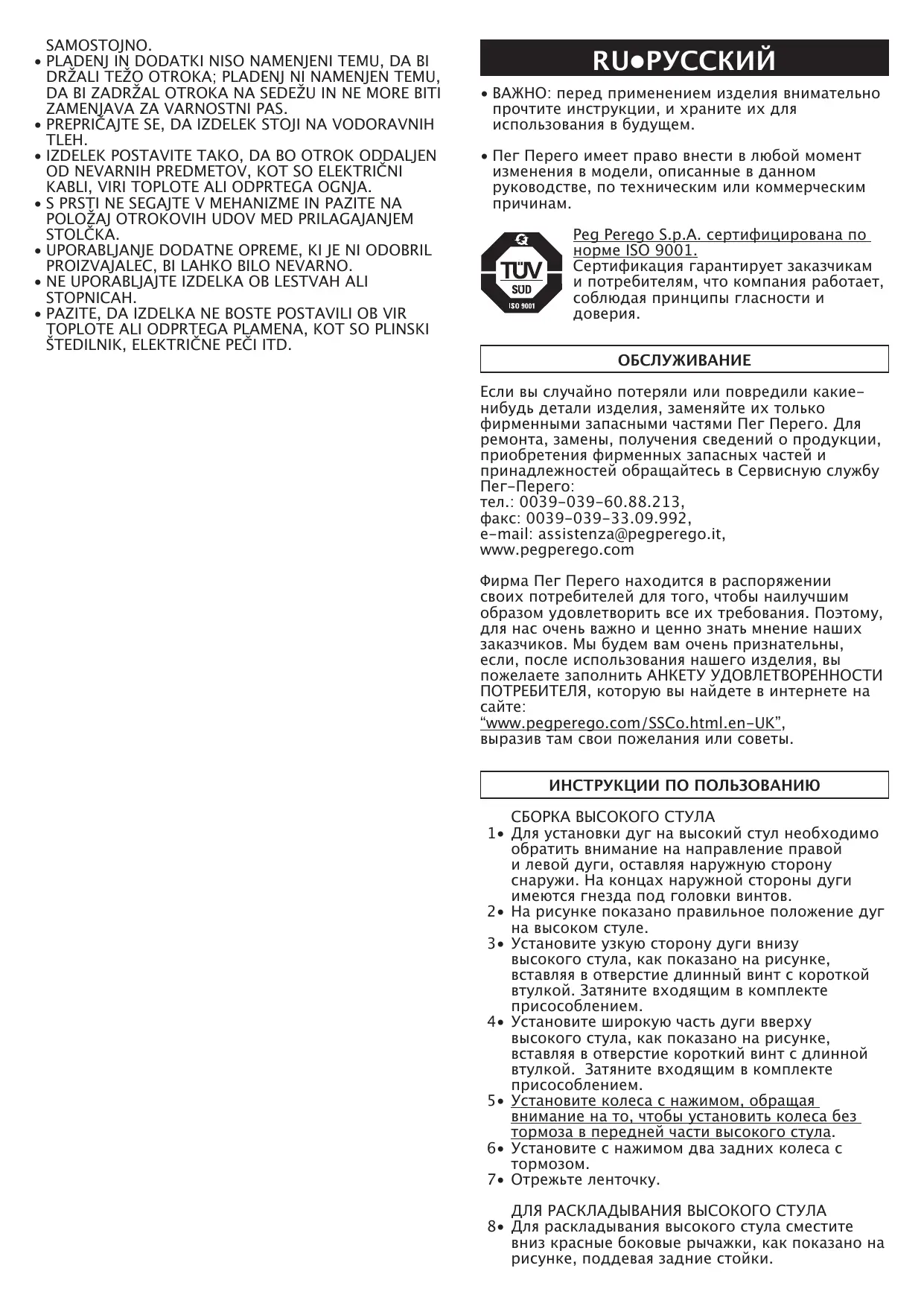 PEG PEREGO pourra apporter à tout moment des modifications aux modèles décrits dans ce manuel. Peg Perego S.p.A. bénéficie de la certification ISO 9001. La certification assure aux clients et aux consommateurs une garantie de transparence et de confiance dans la façon dont travaille lʼentreprise. SERVICE DʼASSISTANCE En cas de perte ou dommage fortuit de pièces du modèle, utilisez exclusivement les pièces de rechange originales Peg Perego. Pour les éventuelles réparations, substitutions, informations sur les produits, la vente de pièces de rechange originales et dʼaccessoires, contactez le Service dʼassistance Peg-Perego: tél.: 0039-039-60.88.213 fax: 0039-039-33.09.992 e-mail: assistenza@pegperego.it www.pegperego.com Peg Perego est à la disposition de ses consommateurs pour satisfaire au mieux toutes leurs exigences. À cette fin, connaître lʼavis de nos clients est pour nous extrêmement important et précieux. Nous vous saurions donc gré, après avoir utilisé lʼun de nos produits, de bien vouloir remplir le QUESTIONNAIRE SATISFACTION DU CONSOMMATEUR que vous trouverez sur Internet à lʼadresse suivante: “www.pegperego.com/SSCo.html.en-UK”, et de nous faire vos éventuelles observations ou suggestions. NOTICE DʼEMPLOI ASSEMBLAGE DE LA CHAISE HAUTE 1• Pour monter les gondoles sur la chaise haute, faire attention au sens des gondoles droite et gauche et placer lʼextérieur des gondoles à lʼextérieur. Les extrémités de la partie extérieure des gondoles sont dotées dʼun trou pour la tête des vis. 2• La figure représente la position correcte des gondoles sur la chaise haute. 3• Monter la partie étroite de la gondole en bas de la chaise haute, comme indiqué sur la figure, en insérant dans le trou la vis longue avec la douille courte. Visser avec lʼoutil fourni. 4• Monter la partie large de la gondole en haut de la chaise haute, comme indiqué sur la figure, en insérant dans le trou la vis courte avec la douille longue. Visser avec lʼoutil fourni. 5• Appliquer par pression les roues sans freins à l'avant de la chaise haute. 6• Appliquer les deux roues arrière avec freins. 7• Couper le collier. OUVERTURE DE LA CHAISE HAUTE 8• Pour ouvrir la chaise haute, pousser les doigts rouges latéraux vers le bas, comme indiqué sur la figure, en faisant levier sur les montants arrière. 9• Accompagner lʼouverture en abaissant le barreau arrière jusquʼau clic. 10• Abaisser le repose-pied, comme indiqué sur la figure. 11• Au déballage, la position du siège de la chaise haute nʼest pas adaptée à lʼemploi (position