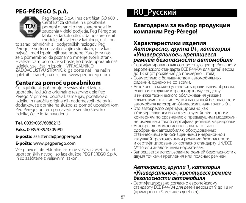 PEG-PEREGO S.p.A. Peg-Perego S.p.A. сертифицирована по ISO 9001. Сертификация гарантирует заказчикам и потребителям, что компания работает, соблюдая принципы гласности и доверия. Компания PegPerego имеет право вносить в любой 92