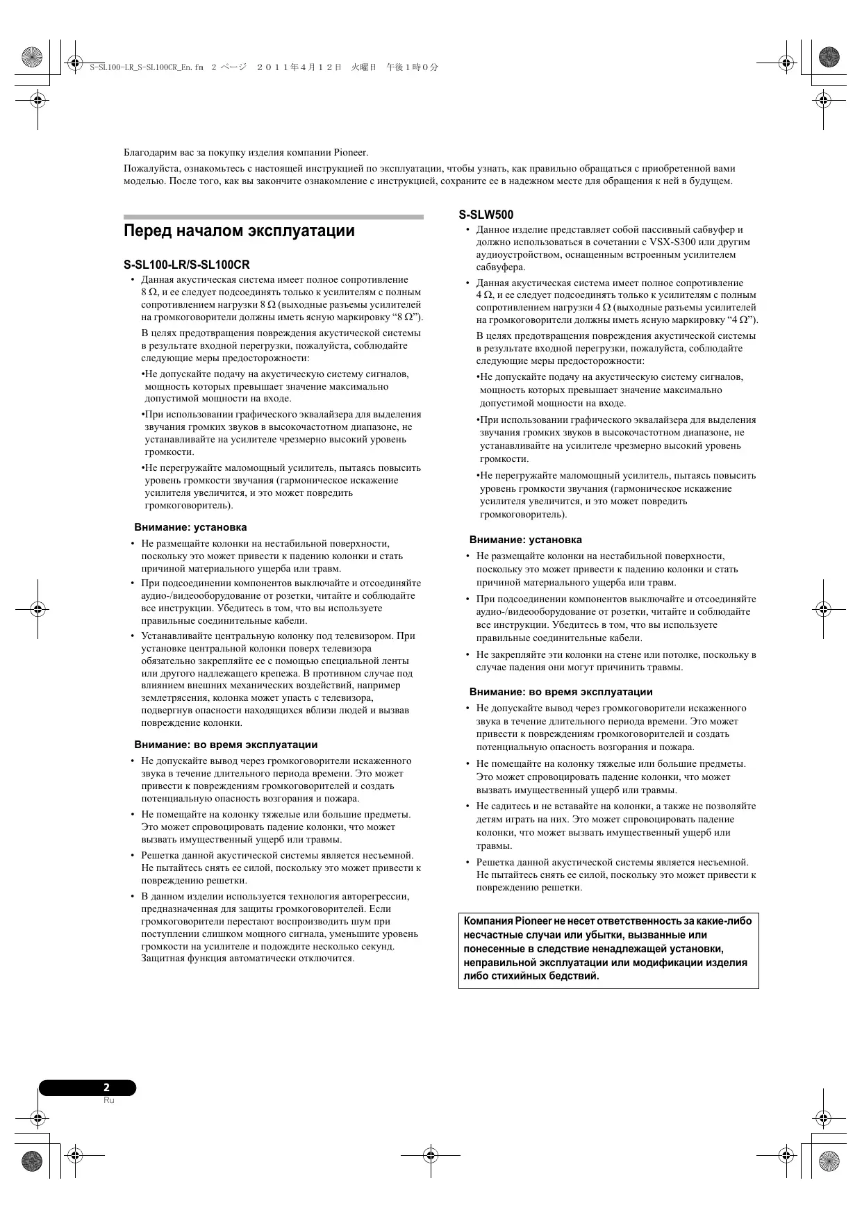 Компания Pioneer не несет ответственность за какие-либо несчастные случаи или убытки, вызванные или понесенные в следствие ненадлежащей установки, неправильной эксплуатации или модификации изделия либо стихийных бедствий.