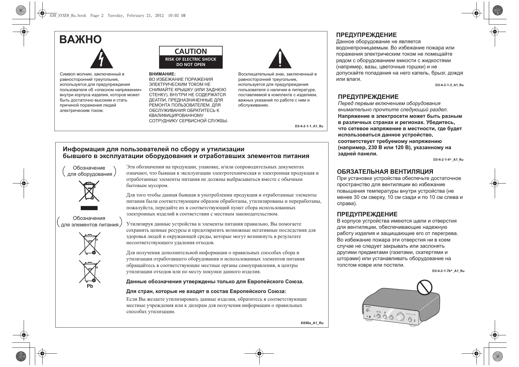 МЕРЫ ПРЕДОСТОРОЖНОСТИ ПРИ ОБРАЩЕНИИ С СЕТЕВЫМ ШНУРОМ Держите сетевой шнур за вилку. Не вытаскивайте вилку, взявшись за шнур, и никогда не касайтесь сетевого шнура, если Ваши руки влажные, так как это может привести к короткому замыканию или поражению электрическим током. Не ставьте аппарат, предметы мебели и т.д. на сетевой шнур, не зажимайте его. Не завязывайте узлов на шнуре и не связывайте его с другими шнурами. Сетевые шнуры должны лежать так, чтобы на них нельзя было наступить. Поврежденный сетевой шнур может стать причиной возникновения пожара или поразить Вас электрическим током. Время от времени проверяйте сетевой шнур. В случае обнаружения повреждения обратитесь за заменой в ближайший официальный сервисный центр фирмы PIONEER или к Вашему дилеру. S002*_A1_Ru