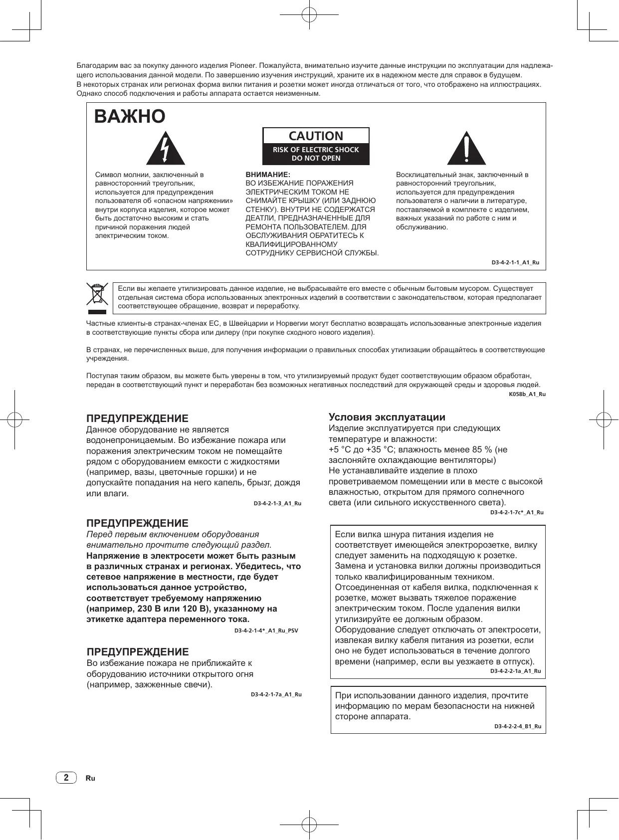 Благодарим вас за покупку данного изделия Pioneer. Пожалуйста, внимательно изучите данные инструкции по эксплуатации для надлежащего использования данной модели. По завершению изучения инструкций, храните их в надежном месте для справок в будущем. В некоторых странах или регионах форма вилки питания и розетки может иногда отличаться от того, что отображено на иллюстрациях. Однако способ подключения и работы аппарата остается неизменным. BAЖHO CAUTION