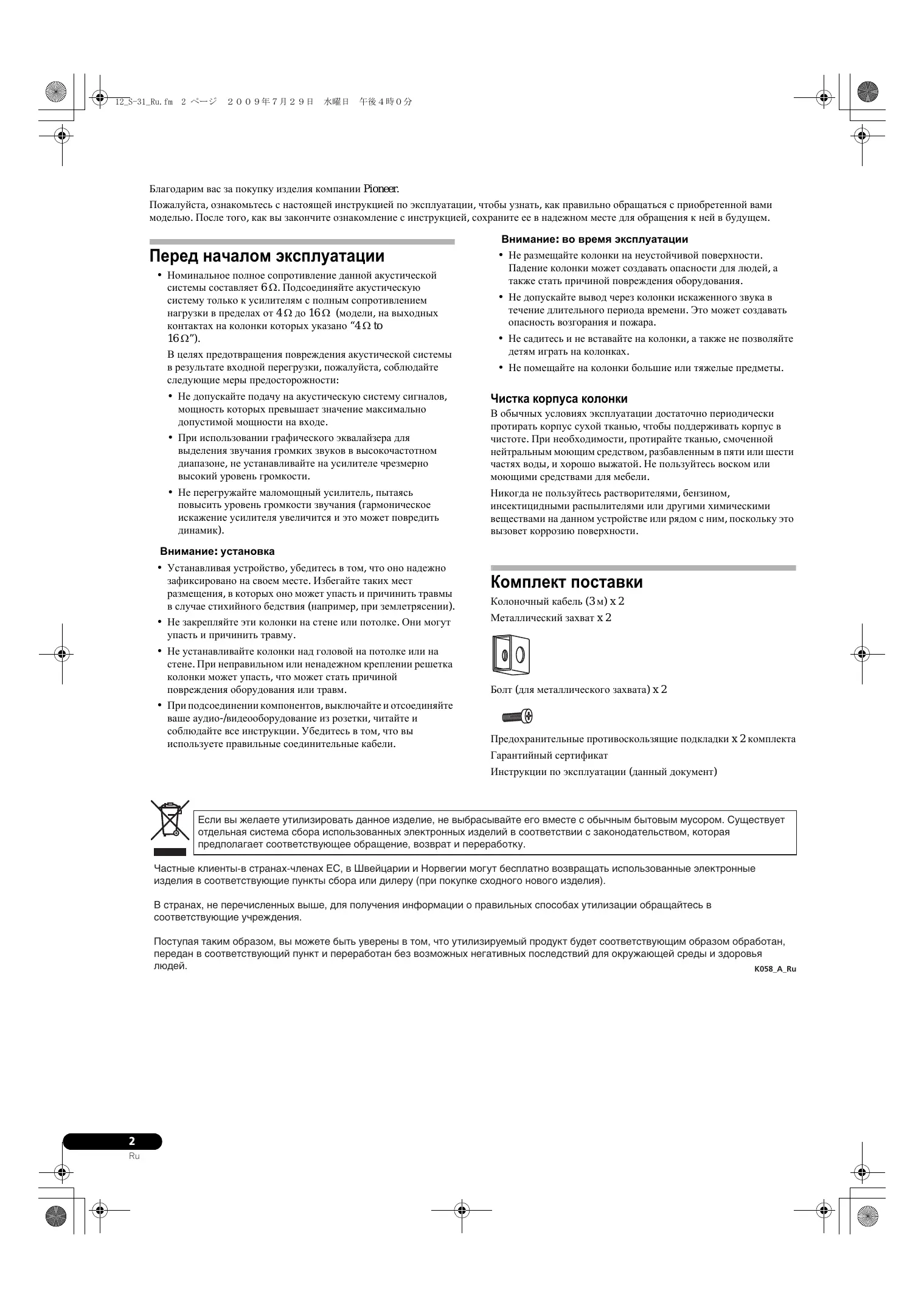 Если вы желаете утилизировать данное изделие, не выбрасывайте его вместе с обычным бытовым мусором. Существует отдельная система сбора использованных электронных изделий в соответствии с законодательством, которая предполагает соответствующее обращение, возврат и переработку. Чacтные клиенты-в странах-членах ЕС, в Швейцарии и Норвегии могут бесплатно возвращать использованные электронные изделия в соответствующие пункты сбора или дилеру (при покупке сходного нового изделия). В странах, не перечисленных выше, для получения информации о правильных способах утилизации обращайтесь в cooтветcтвующие учреждения. Поступая таким образом, вы можете быть уверены в том, что утилизируемый продукт будет соответствующим образом обработан, передан в соответствующий пункт и переработан без возможных негативных последствий для окружающей среды и здоровья людей. K058_A_Ru
