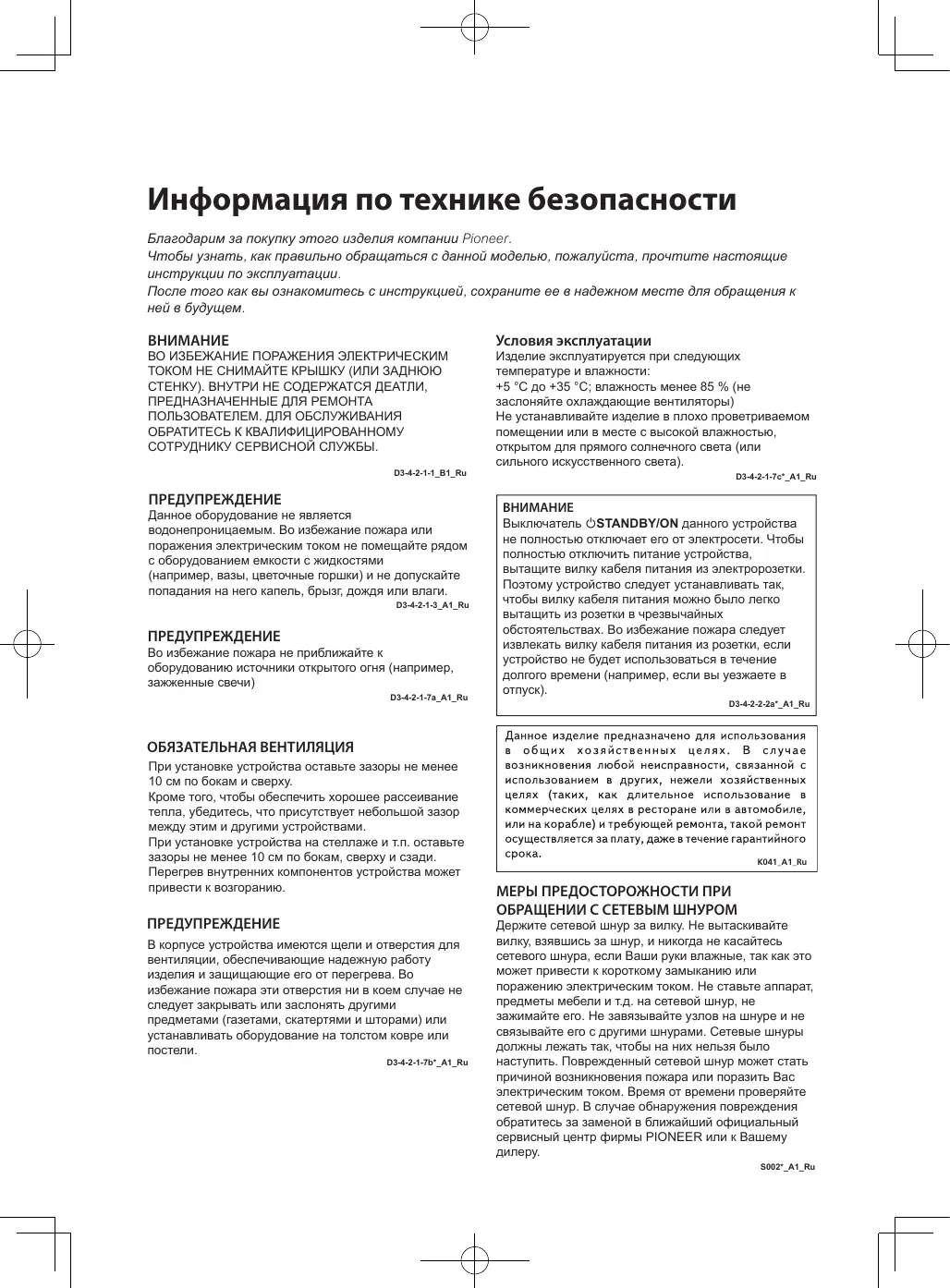 Информация по технике безопасности Благодарим за покупку этого изделия компании Pioneer. Чтобы узнать, как правильно обращаться с данной моделью, пожалуйста, прочтите настоящие инструкции по эксплуатации. После того как вы ознакомитесь с инструкцией, сохраните ее в надежном месте для обращения к ней в будущем.