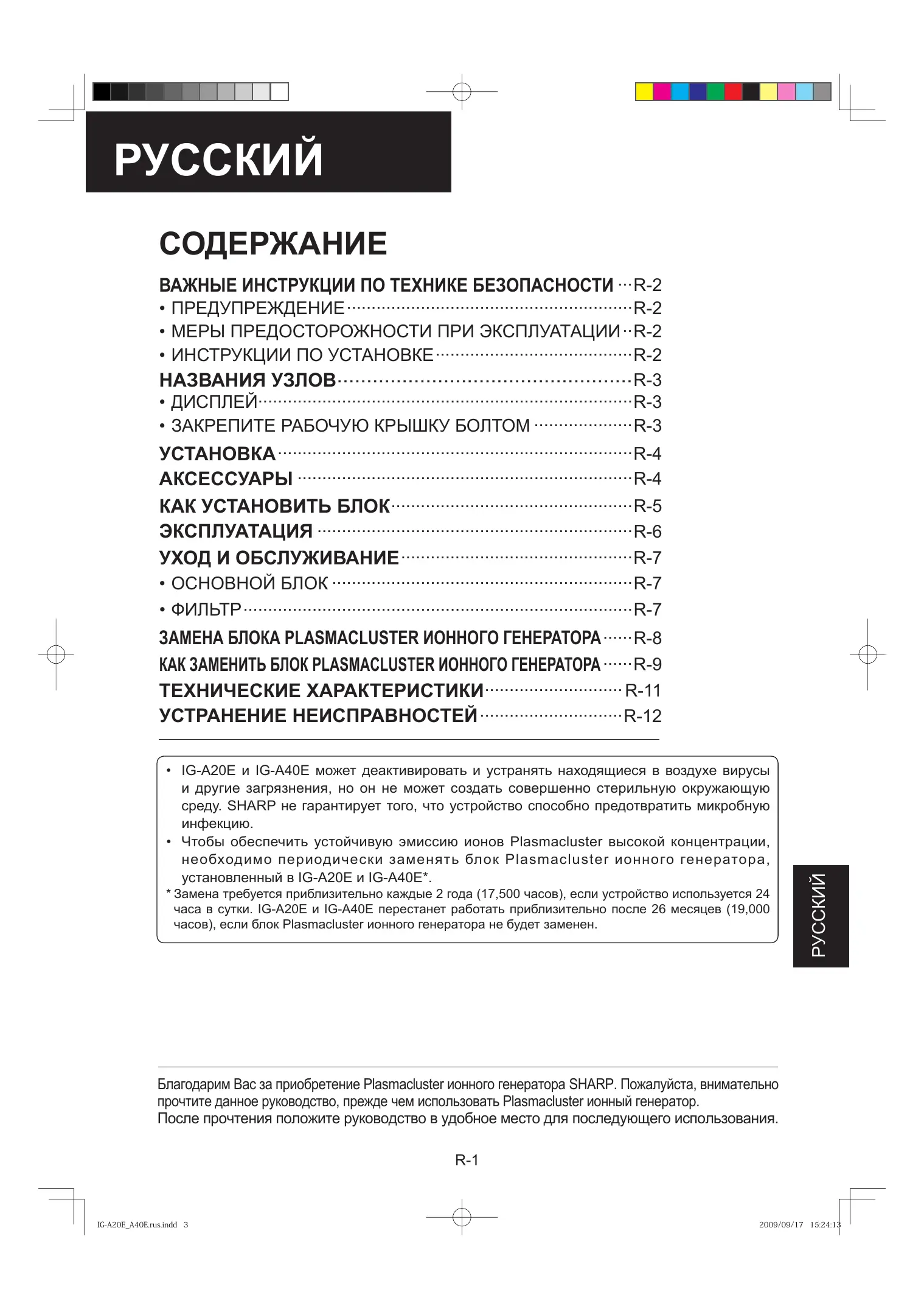 - ФИЛЬТР ............................................................................... R-7 ЗАМЕНА БЛОКА PLASMACLUSTER ИОННОГО ГЕНЕРАТОРА ...... R-8 КАК ЗАМЕНИТЬ БЛОК PLASMACLUSTER ИОННОГО ГЕНЕРАТОРА ...... R-9 ТЕХНИЧЕСКИЕ ХАРАКТЕРИСТИКИ............................ R-11 УСТРАНЕНИЕ НЕИСПРАВНОСТЕЙ ............................. R-12 Благодарим Вас за приобретение Plasmacluster ионного генератора SHARP. Пожалуйста, внимательно прочтите данное руководство, прежде чем использовать Plasmacluster ионный генератор. После прочтения положите руководство в удобное место для последующего использования. R-1 IG-A20E̲A40E.rus.indd 3 2009/09/17 15:24:13 ВАЖНЫЕ ИНСТРУКЦИИ ПО ТЕХНИКЕ БЕЗОПАСНОСТИ При эксплуатации электрических приборов необходимо соблюдать основные меры предосторожности, которые включают следующее: ПРЕДУПРЕЖДЕНИЕ – Для снижения вероятности поражения электрическим током, возгорания и травматизма: