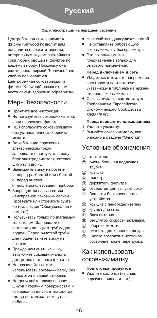 Не касайтесь движущихся частей. Не оставляйте работающую соковыжималку без присмотра. Эта соковыжималка предназначена только для бытового применения. Перед включением в сеть Убедитесь в том, что напряжение электросети соответствует указанному в табличке на нижней стороне соковыжималки. Соковыжималка соответствует Требованиям Европейского Экономического Сообщества 89/336/ЕЕС.