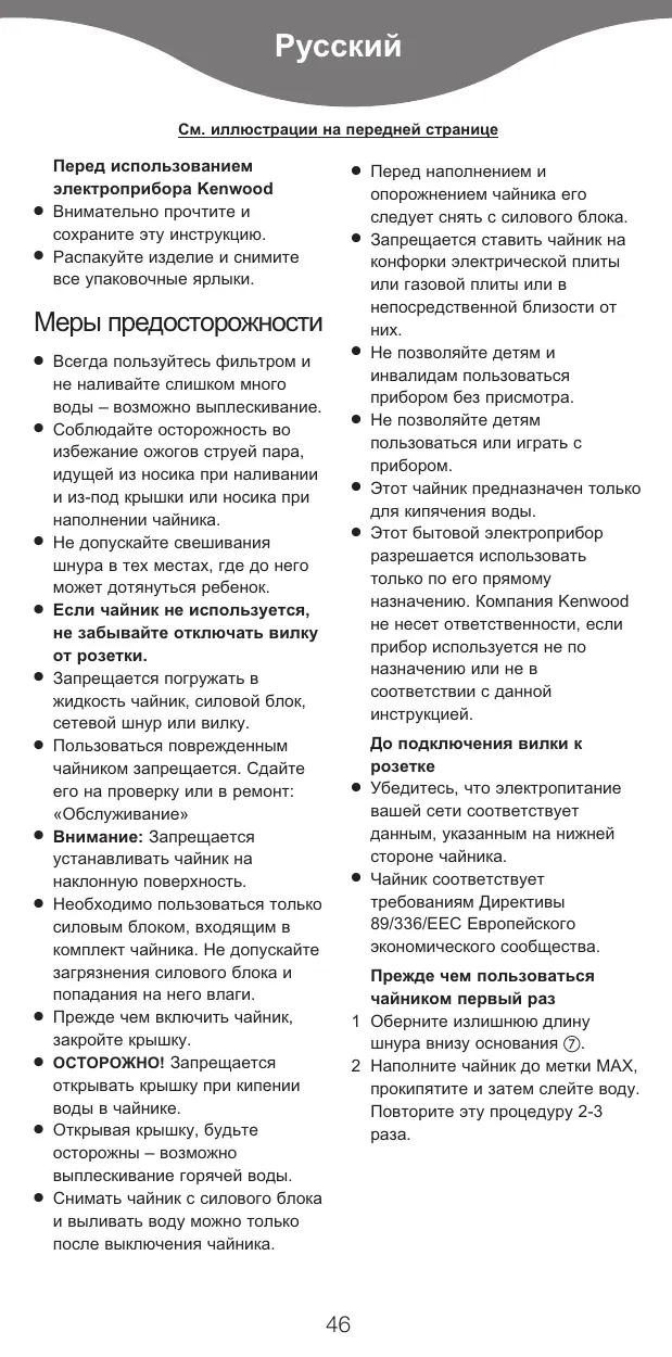 Перед наполнением и опорожнением чайника его следует снять с силового блока. Запрещается ставить чайник на конфорки электрической плиты или газовой плиты или в непосредственной близости от Не позволяйте детям и инвалидам пользоваться прибором без присмотра. Не позволяйте детям пользоваться или играть с Этот чайник предназначен только для кипячения воды. Этот бытовой электроприбор разрешается использовать только по его прямому назначению. Компания Kenwood не несет ответственности, если прибор используется не по назначению или не в соответствии с данной инструкцией. До подключения вилки к Убедитесь, что электропитание вашей сети соответствует данным, указанным на нижней стороне чайника. Чайник соответствует требованиям Директивы 89/336/ЕЕС Европейского экономического сообщества. Прежде чем пользоваться чайником первый раз 1 Оберните излишнюю длину шнура внизу основания . 2 Наполните чайник до метки МАХ, прокипятите и затем слейте воду. Повторите эту процедуру 2-3