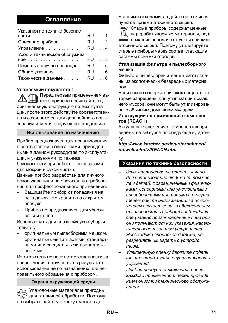 машними отходами, а сдайте ее в один из пунктов приема вторичного сырья. Старые приборы содержат ценные перерабатываемые материалы, подлежащие передаче в пункты приемки вторичного сырья. Поэтому утилизируйте старые приборы через соответствующие системы приемки отходов. Утилизация фильтра и пылесборного мешка Фильтр и пылесборный мешок изготовлены из экологически безвредных материа лов. Если они не содержат никаких веществ, которые запрещены для утилизации домаш него мусора, они могут быть утилизированы с обычным домашним мусором. Инструкции по применению компонен тов (REACH) Актуальные сведения о компонентах при ведены на веб-узле по следующему адресу: http://www.karcher.de/de/unternehmen/ umweltschutz/REACH.htm