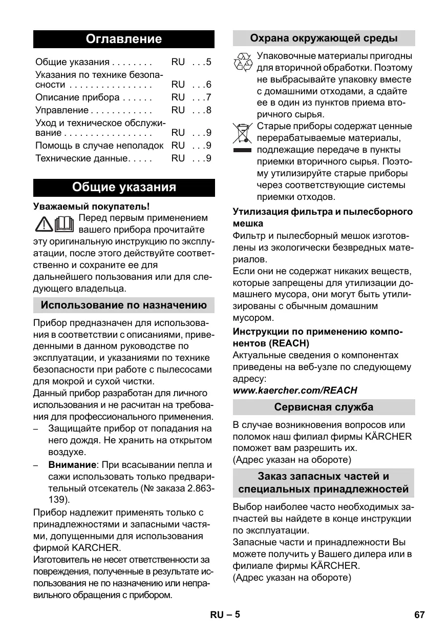 Утилизация фильтра и пылесборного мешка Фильтр и пылесборный мешок изготовлены из экологически безвредных материалов. Если они не содержат никаких веществ, которые запрещены для утилизации домашнего мусора, они могут быть утилизированы с обычным домашним мусором. Инструкции по применению компонентов (REACH) Актуальные сведения о компонентах приведены на веб-узле по следующему адресу: www.kaercher.com/REACH