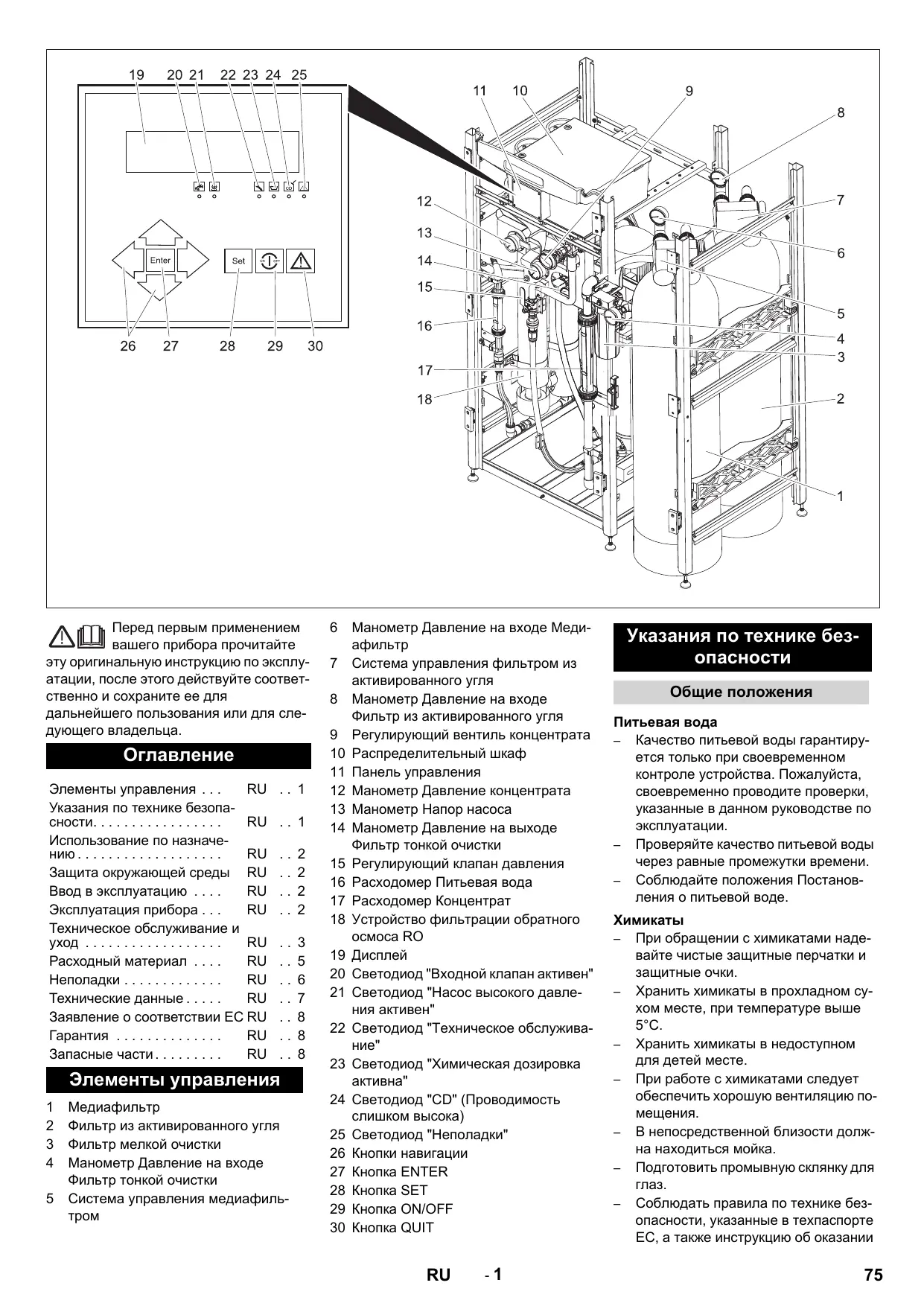 Consignes de sécurité . . . . Utilisation conforme . . . . . . Protection de l’environnement Mise en service. . . . . . . . . . Fonctionnement . . . . . . . . . Entretien et maintenance . . Matériel de consommation . Pannes . . . . . . . . . . . . . . . . Manomètre de la pression d'entré du filtre media Commande du filtre à charbon actif Manomètre de la pression d'entrée du filtre à charbon actif