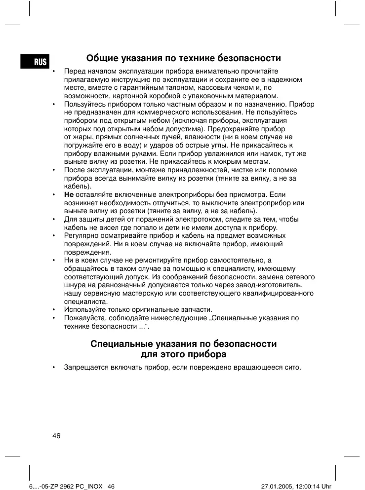 Перед началом эксплуатации прибора внимательно прочитайте прилагаемую инструкцию по эксплуатации и сохраните ее в надежном месте, вместе с гарантийным талоном, кассовым чеком и, по возможности, картонной коробкой с упаковочным материалом. Пользуйтесь прибором только частным образом и по назначению. Прибор не предназначен для коммерческого использования. Не пользуйтесь прибором под открытым небом (исключая приборы, эксплуатация которых под открытым небом допустима). Предохраняйте прибор от жары, прямых солнечных лучей, влажности (ни в коем случае не погружайте его в воду) и ударов об острые углы. Не прикасайтесь к прибору влажными руками. Если прибор увлажнился или намок, тут же выньте вилку из розетки. Не прикасайтесь к мокрым местам. После эксплуатации, монтаже принадлежностей, чистке или поломке прибора всегда вынимайте вилку из розетки (тяните за вилку, а не за кабель). Не оставляйте включенные электроприборы без присмотра. Если возникнет необходимость отлучиться, то выключите электроприбор или выньте вилку из розетки (тяните за вилку, а не за кабель). Для защиты детей от поражений электротоком, следите за тем, чтобы кабель не висел где попало и дети не имели доступа к прибору. Регулярно осматривайте прибор и кабель на предмет возможных повреждений. Ни в коем случае не включайте прибор, имеющий повреждения. Ни в коем случае не ремонтируйте прибор самостоятельно, а обращайтесь в таком случае за помощью к специалисту, имеющему соответствующий допуск. Из соображений безопасности, замена сетевого шнура на равнозначный допускается только через завод-изготовитель, нашу сервисную мастерскую или соответствующего квалифицированного специалиста. Используйте только оригинальные запчасти. Пожалуйста, соблюдайте нижеследующие „Специальные указания по технике безопасности ...“.