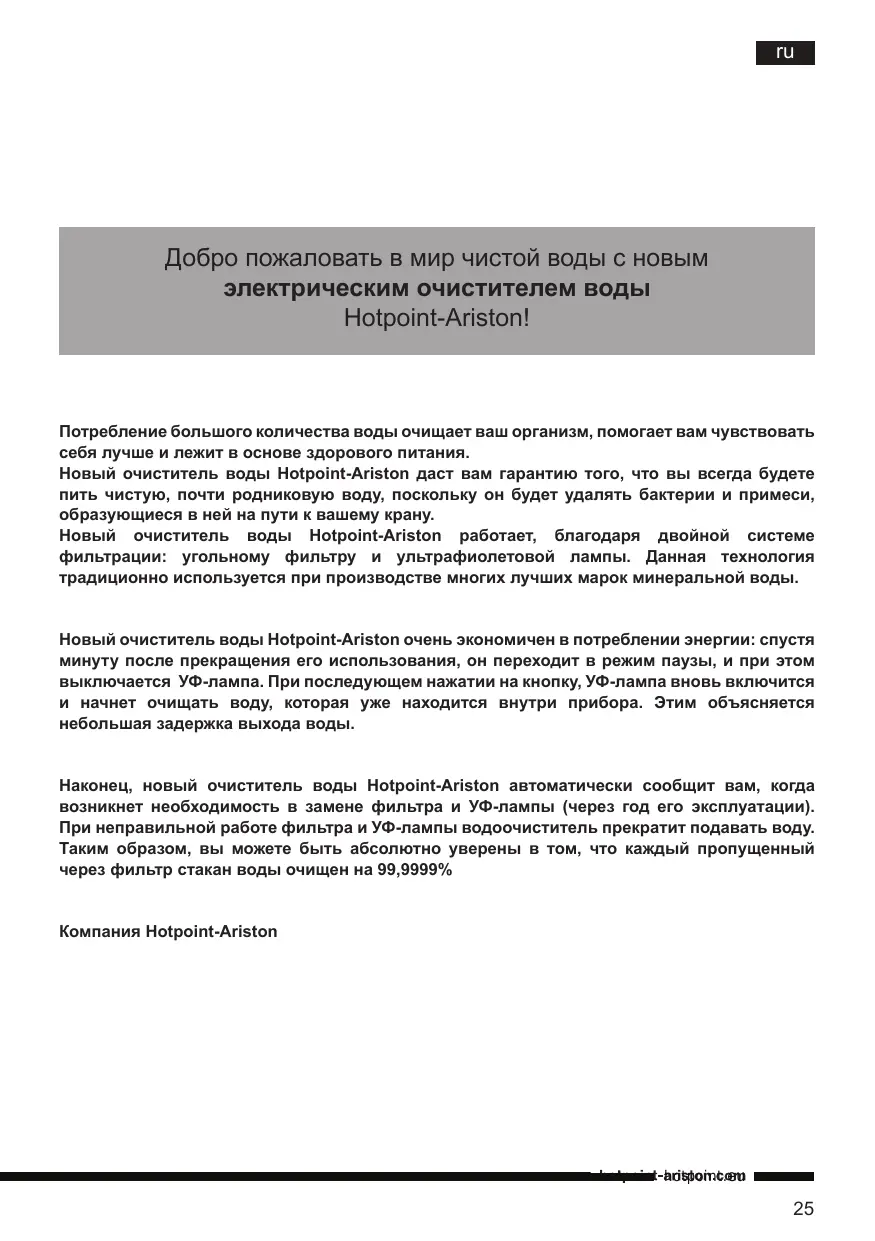Добро пожаловать в мир чистой воды с новым электрическим очистителем воды Hotpoint-Ariston! Потребление большого количества воды очищает ваш организм, помогает вам чувствовать себя лучше и лежит в основе здорового питания. Новый очиститель воды Hotpoint-Ariston даст вам гарантию того, что вы всегда будете пить чистую, почти родниковую воду, поскольку он будет удалять бактерии и примеси, образующиеся в ней на пути к вашему крану. Новый очиститель воды Hotpoint-Ariston работает, благодаря двойной системе фильтрации: угольному фильтру и ультрафиолетовой лампы. Данная технология традиционно используется при производстве многих лучших марок минеральной воды. Новый очиститель воды Hotpoint-Ariston очень экономичен в потреблении энергии: спустя минуту после прекращения его использования, он переходит в режим паузы, и при этом выключается УФ-лампа. При последующем нажатии на кнопку, УФ-лампа вновь включится и начнет очищать воду, которая уже находится внутри прибора. Этим объясняется небольшая задержка выхода воды. Наконец, новый очиститель воды Hotpoint-Ariston автоматически сообщит вам, когда возникнет необходимость в замене фильтра и УФ-лампы (через год его эксплуатации). При неправильной работе фильтра и УФ-лампы водоочиститель прекратит подавать воду. Таким образом, вы можете быть абсолютно уверены в том, что каждый пропущенный через фильтр стакан воды очищен на 99,9999% Компания Hotpoint-Ariston hotpoint.eu