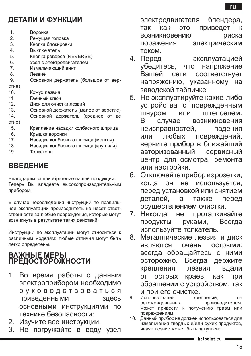 использованием произведите очистку всех съемных деталей (устройства подачи продуктов, воронки, режущей головки, держателя лезвия (большое, среднее, малое отверстие), кожуха лезвия, лезвия, дробящего конуса, дробящего форматора и т.д.). Лезвие является острым, соблюдайте осторожность.
