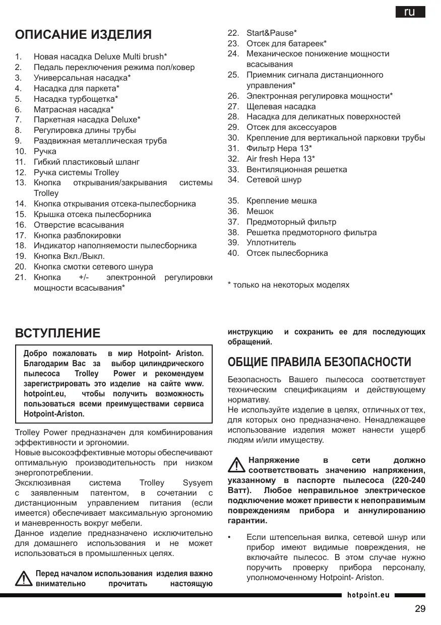 Добро пожаловать в мир Hotpoint- Ariston. Благодарим Вас за выбор цилиндрического Trolley Power и рекомендуем зарегистрировать это изделие на сайте www. hotpoint.eu, чтобы получить возможность пользоваться всеми преимуществами сервиса Hotpoint-Ariston. Trolley Power предназначен для комбинирования эффективности и эргономии. Новые высокоэффективные моторы обеспечивают оптимальную производительность при низком энергопотреблении. Эксклюзивная Trolley Sysyem с заявленным патентом, в сочетании с дистанционным управлением питания (если имеется) обеспечивает максимальную эргономию и маневренность вокруг мебели. Данное изделие предназначено исключительно для домашнего использования и не может использоваться в промышленных целях. Перед началом использования изделия важно внимательно