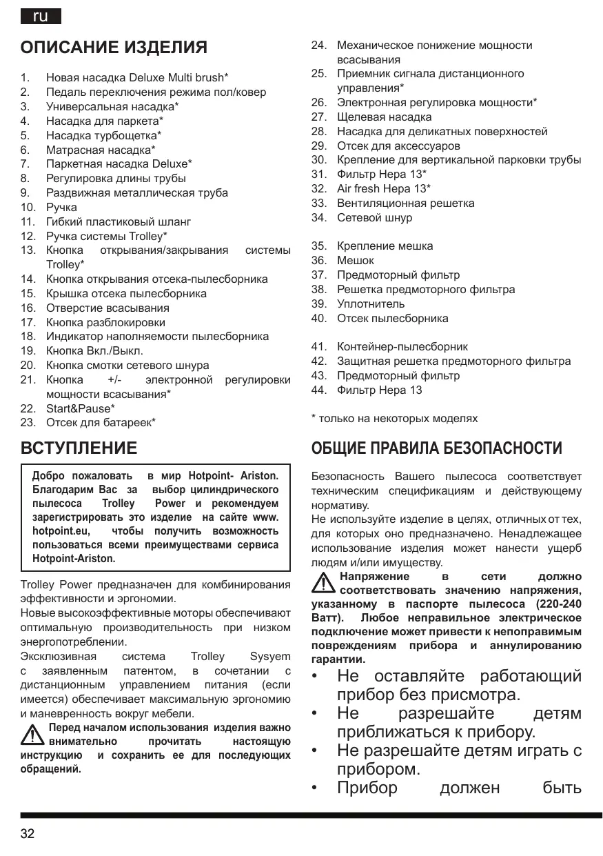 Добро пожаловать в мир Hotpoint- Ariston. Благодарим Вас за выбор цилиндрического Trolley Power и рекомендуем зарегистрировать это изделие на сайте www. hotpoint.eu, чтобы получить возможность пользоваться всеми преимуществами сервиса Hotpoint-Ariston. Trolley Power предназначен для комбинирования эффективности и эргономии. Новые высокоэффективные моторы обеспечивают оптимальную производительность при низком энергопотреблении. Эксклюзивная Trolley Sysyem с заявленным патентом, в сочетании с дистанционным управлением питания (если имеется) обеспечивает максимальную эргономию и маневренность вокруг мебели. Перед началом использования изделия важно внимательно