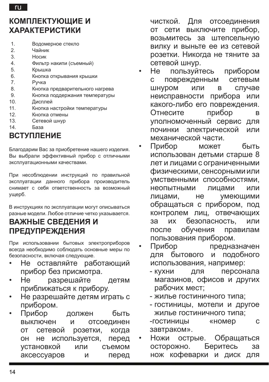 Подключите к сети и используйте прибор только в соответствии с данными на заводской табличке. Перед началом эксплуатации прочитайте все инструкции. Сетевой шнур не должен свисать со стола или кухонного топа или касаться горячих поверхностей. Не помещайте прибор рядом с горячей газовой или электрической варочной панелью или в нагретую духовку. Не используйте прибор без воды во избежание повреждения нагревательных элементов. Проверьте, чтобы чайник использовался на устойчивой и ровной поверхности, вне досягаемости детей во избежание опрокидывания чайника и несчастных Во избежание возгорания, удара током или несчастных случаев не погружайте сетевой шнур, штепсельную вилку или чайник в воду или в другие жидкости. Пока вода кипит или сразу же после закипания избегайте струи пара. Осторожно наливайте воду без резкого опрокидывания чайника. Проявляйте осторожность при доливе воды в горячий чайник. База чайника не может быть использована в целях, отличных от тех, для которых она предназначена. Переносите чайник с горячей водой крайне Использование дополнительных аксессуаров, не рекомендованных или не продаваемых производителем приборов, может привести к пожару, удару током или несчастным случаям. Отсоединяйте чайник от электросети, когда он не используется или перед его чисткой. Дайте чайнику остыть перед установкой или съемом деталей и перед чисткой. Данный прибор укомплектован штепсельной вилкой с заземлением. Проверьте, чтобы настенная сетевая розетка имела заземление. Не используйте прибор в целях, отличных от тех, для которых он предназначен. Данный прибор не предназначен для использования лицами (включая детей) с ограниченными физическими, сенсорными