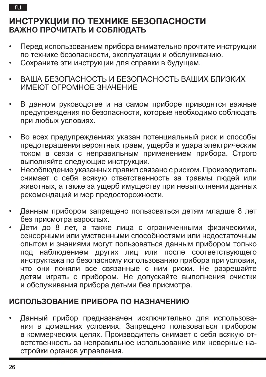 Данный прибор предназначен исключительно для использования в домашних условиях. Запрещено пользоваться прибором в коммерческих целях. Производитель снимает с себя всякую ответственность за неправильное использование или неверные настройки органов управления.