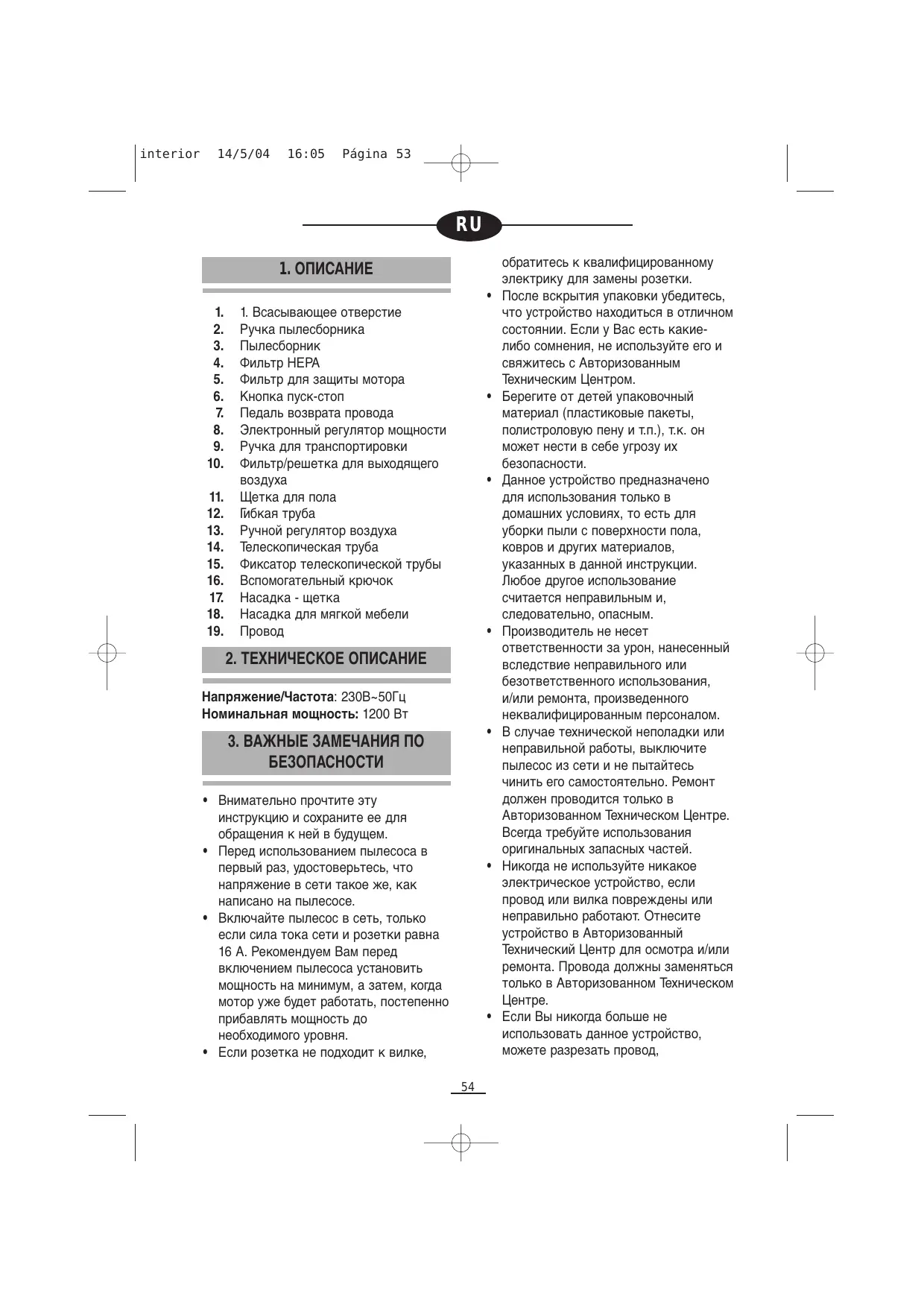 обратитесь к квалифицированному электрику для замены розетки. После вскрытия упаковки убедитесь, что устройство находиться в отличном состоянии. Если у Вас есть какиелибо сомнения, не используйте его и свяжитесь с Авторизованным Техническим Центром. Берегите от детей упаковочный материал (пластиковые пакеты, полистроловую пену и т.п.), т.к. он может нести в себе угрозу их безопасности. Данное устройство предназначено для использования только в домашних условиях, то есть для уборки пыли с поверхности пола, ковров и других материалов, указанных в данной инструкции. Любое другое использование считается неправильным и, следовательно, опасным. Производитель не несет ответственности за урон, нанесенный вследствие неправильного или безответственного использования, и/или ремонта, произведенного неквалифицированным персоналом. В случае технической неполадки или неправильной работы, выключите пылесос из сети и не пытайтесь чинить его самостоятельно. Ремонт должен проводится только в Авторизованном Техническом Центре. Всегда требуйте использования оригинальных запасных частей. Никогда не используйте никакое электрическое устройство, если провод или вилка повреждены или неправильно работают. Отнесите устройство в Авторизованный Технический Центр для осмотра и/или ремонта. Провода должны заменяться только в Авторизованном Техническом Если Вы никогда больше не использовать данное устройство, можете разрезать провод, interior 14/5/04 16:06 Página 54 предварительно убедившись, что устройство отключено от сети. Некоторые основные правила должны соблюдаться при использовании любых электрических устройств: В особенности