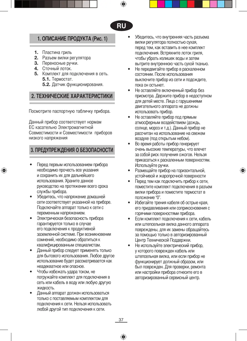 Убедитесь, что внутренняя часть разъема вилки регулятора полностью сухая, перед тем, как вставить в нее комплект подключения. Встряхните лоток гриля, чтобы убрать излишек воды и затем вытрите внутреннюю часть сухой тканью. Не передвигайте прибор в раскаленном состоянии. После использования выключите прибор из сети и подождите, пока он остынет. Не оставляйте включенный прибор без присмотра. Держите прибор в недоступном для детей месте. Лица с гарушениями двигательного аппарата не должны использовать прибор. Не оставляйте прибор под прямым атмосферным воздействием (дождь, солнце, мороз и т.д.). Данный прибор не рассчитан на использование на свежем воздухе (под открытым небом). Во время работы прибор генерирует очень высокие температуры, что влечет за собой риск получения ожогов. Нельзя прикасаться к раскаленным поверхностям. Используйте ручки. Размещайте прибор на горизонтальной, устойчивой и жаропрочной поверхности Перед тем как подключить прибор к сети, поместите комплект подключения в разъем вилки прибора и поместите термостат в положение “0”. Избегайте трения кабеля об острые края, его придавливания или соприкосновения с горячими поверхностями прибора. Если комплект подключения к сети, кабель или штепсельная вилка данного аппарата повреждены, для их замены обращайтесь за помощью только в авторизированный Центр Технической Поддержки. Не используйте электрический прибор, у которого поврежден кабель или штепсельная вилка, или если прибор не функционирует должный образом, или был поврежден. Для проверки, ремонта или настройки прибора отнесите его в авторизированный сервисный центр.