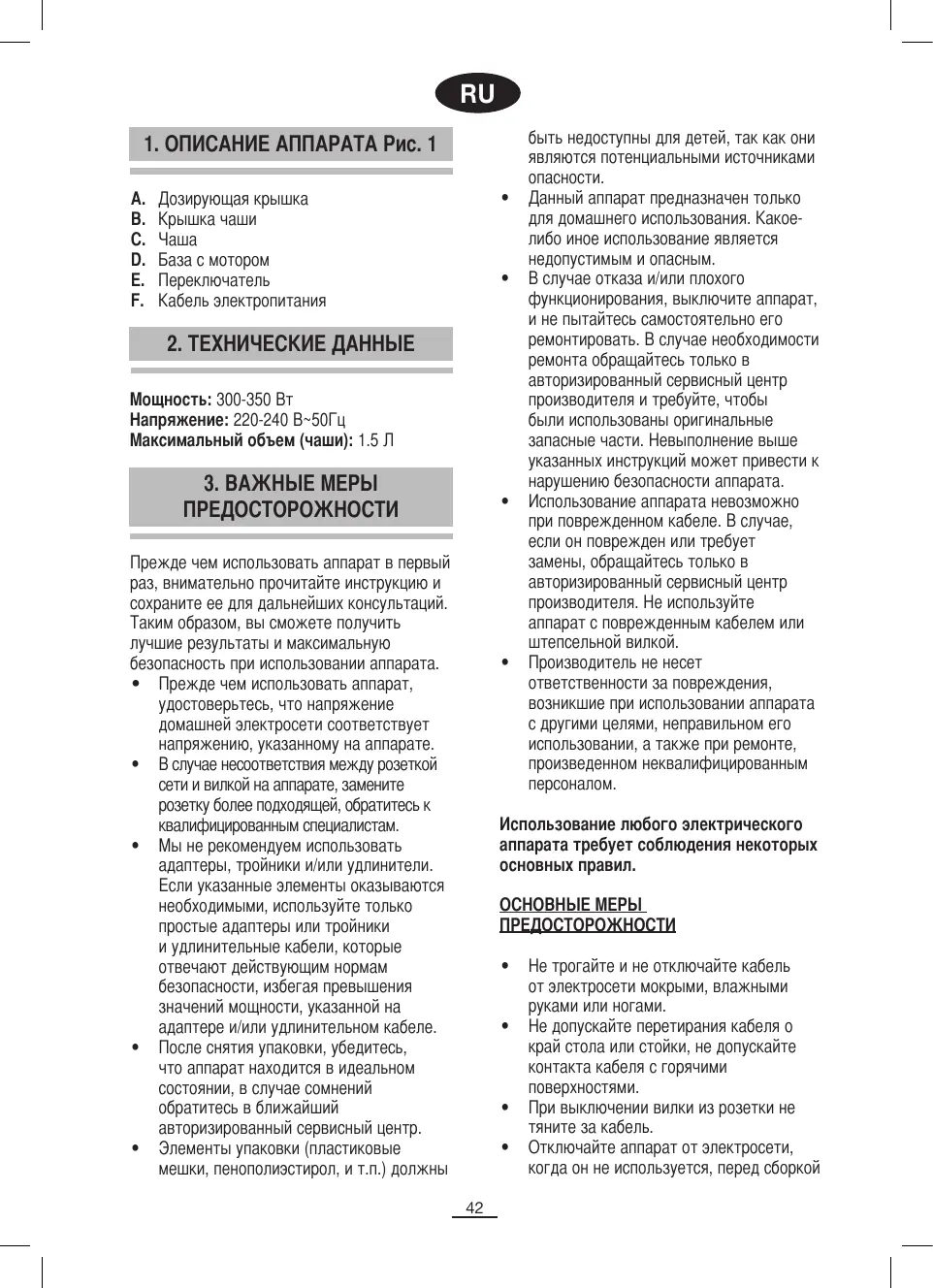 Мощность: 300-350 Вт Напряжение: 220-240 В~50Гц Максимальный объем (чаши): 1.5 Л