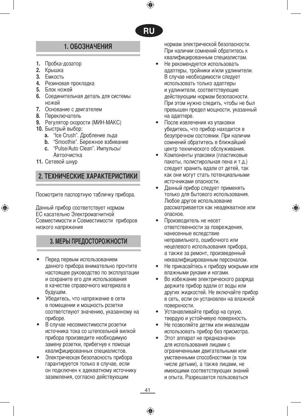 аппаратом только под наблюдением или руководством лица, ответственного за его безопасное применение. Детям запрещается играть с аппаратом. Для повышения степени безопасности использования прибора рекомендуется установка устройства защитного отключения (УЗО) для силы тока, не превышающей 30 мА. Воспользуйтесь при этом советом монтажника. Не оставляйте включенный утюг без присмотра, так как он может стать источником опасности. Вынимая штепсельную вилку из розетки, никогда не тяните за шнур питания. Отключайте прибор от сети перед началом любых операций по чистке и обслуживанию. В случае поломки или неправильной работы прибора прекратите его использование, выключите его и не пытайтесь починить. В случае необходимости ремонта, обращайтесь исключительно в центр технического обслуживания, сертифицированный производителем, с запросом на замену оригинальных деталей. При повреждении шнура питания данного прибора обращайтесь в сертифицированный центр технического обслуживания для его замены. Не подвергайте прибор воздействию природных явлений (таких как дождь, солнце, лед и т.д.). Не используйте и не располагайте никакие части данного прибора на горячих поверхностях (газовых или электрических варочных поверхностях или плитах). Не используйте моющие средства или абразивные ткани для чистки прибора. Не прикасайтесь к горячим поверхностям. Используйте ручки или Не допускайте, чтобы шнур питания касался горячих частей прибора. Нож очень острый, обращайтесь с ним очень осторожно во избежание порезов Не наполняйте емкость больше максимального уровня. Не снимайте емкость с двигателя во время работы устройства.