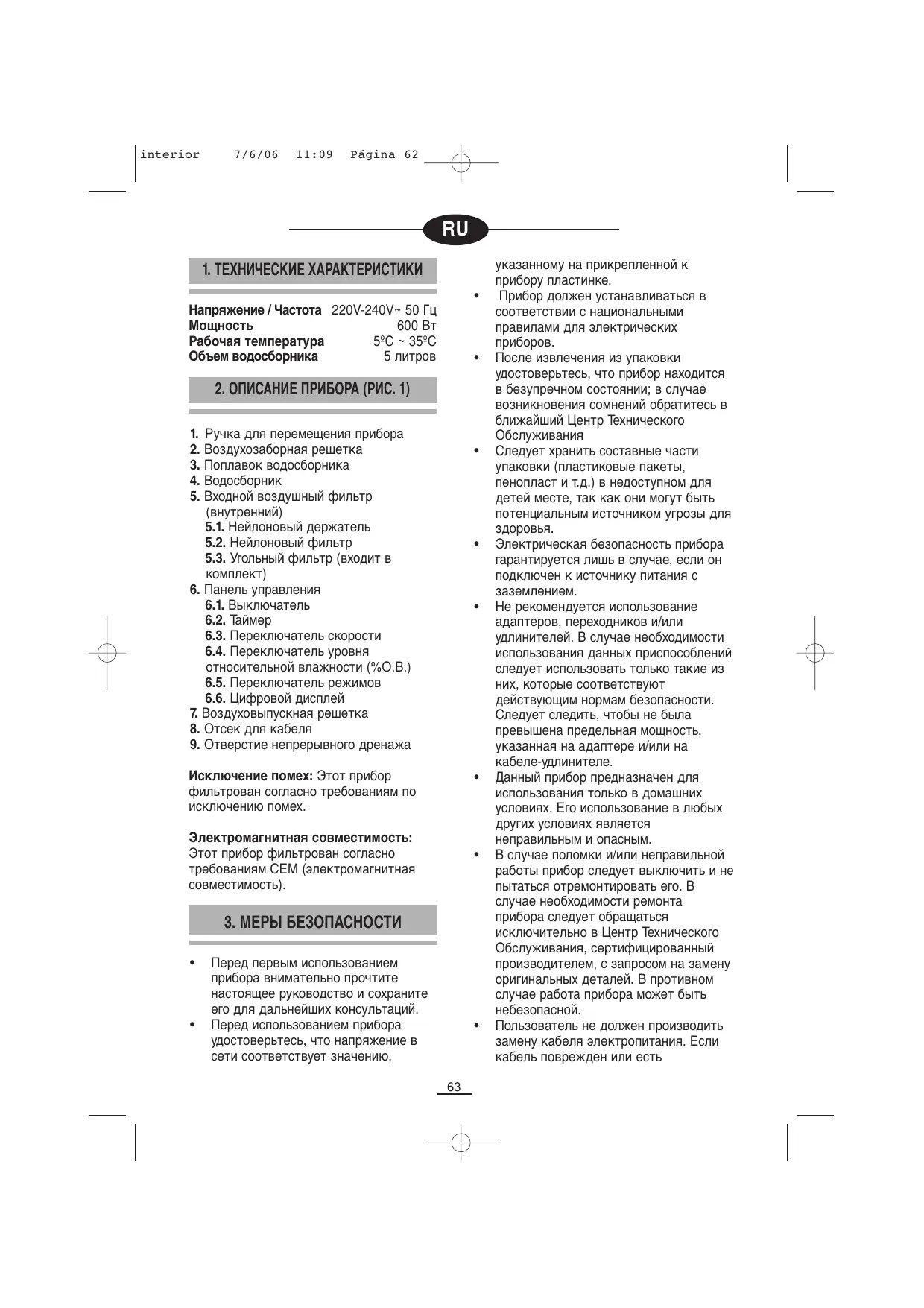 Filtro de entrada de ar (interno) 5.1. Suporte de Nylon 5.2. Filtro de Nylon 5.3. Filtro de carvão vegetal (incluído) Painel de comandos 6.1. Interruptor 6.2. Temporizador 6.3. Selector de velocidade 6.4. Selector % R.H. 6.5. Selector de função 6.6. Visor Grelha de saída de ar Alojamento para cabo Orifício de drenagem contínua