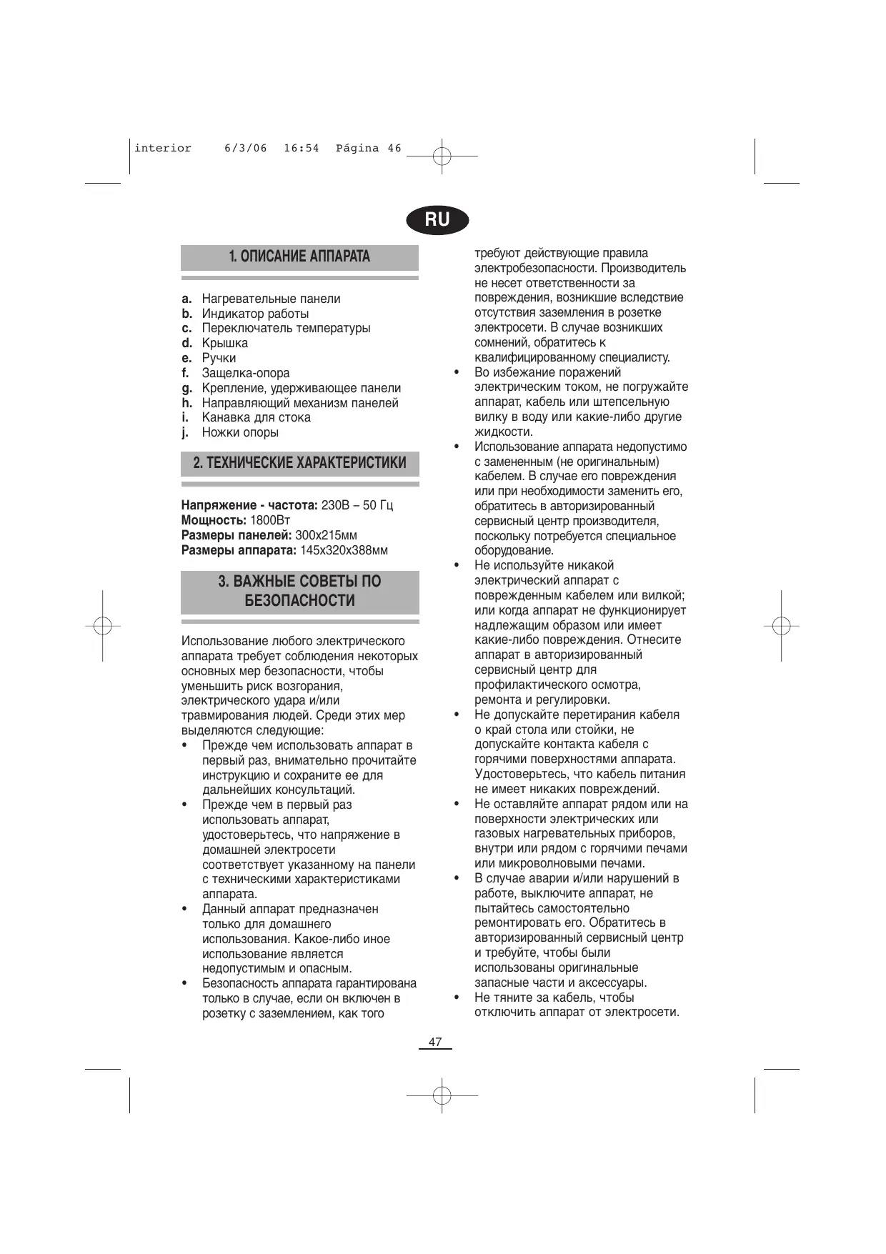 требуют действующие правила электробезопасности. Производитель не несет ответственности за повреждения, возникшие вследствие отсутствия заземления в розетке электросети. В случае возникших сомнений, обратитесь к квалифицированному специалисту. Во избежание поражений электрическим током, не погружайте аппарат, кабель или штепсельную вилку в воду или какие-либо другие Использование аппарата недопустимо с замененным (не оригинальным) кабелем. В случае его повреждения или при необходимости заменить его, обратитесь в авторизированный сервисный центр производителя, поскольку потребуется специальное оборудование. Не используйте никакой электрический аппарат с поврежденным кабелем или вилкой; или когда аппарат не функционирует надлежащим образом или имеет какие-либо повреждения. Отнесите аппарат в авторизированный сервисный центр для профилактического осмотра, ремонта и регулировки. Не допускайте перетирания кабеля о край стола или стойки, не допускайте контакта кабеля с горячими поверхностями аппарата. Удостоверьтесь, что кабель питания не имеет никаких повреждений. Не оставляйте аппарат рядом или на поверхности электрических или газовых нагревательных приборов, внутри или рядом с горячими печами или микроволновыми печами. В случае аварии и/или нарушений в работе, выключите аппарат, не пытайтесь самостоятельно ремонтировать его. Обратитесь в авторизированный сервисный центр и требуйте, чтобы были использованы оригинальные запасные части и аксессуары. Не тяните за кабель, чтобы отключить аппарат от электросети. interior 6/3/06