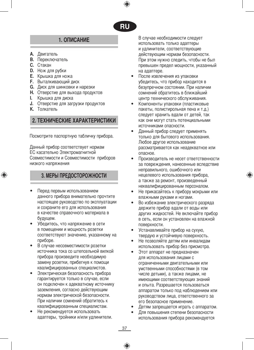 • Técnica autorizado por el fabricante y solicitar el uso de recambios originales. • Si el cable de este aparato resulta dañado, diríjase a un Centro de Asistencia técnico autorizado para que lo sustituyan. • No deje el aparato expuesto a los agentes atmosféricos (lluvia, sol, hielo etc.). • No utilice o coloque ninguna parte de este aparato sobre o cerca de superficies calientes (placas de cocina de gas o eléctrica u hornos). • No utilice detergentes o bayetas abrasivas para limpiar la unidad. • Coloque un recipiente debajo de la boca de salida de alimentos, al trabajar con el disco de rallar y laminar. • No trabaje con la cuchilla o el disco más de 1 minuto cada vez. Después de 1 minuto en funcionamiento, déjelo enfriar 5 minutos. • No intente cortar o trocear alimentos duros, como café, cubitos de hielo, azúcar, arroz, especias, etc. • Retire los huesos y ternillas antes de colocar carne en el vaso. • No corte o ralle alimentos como el queso, tomates, limones, dátiles, melocotones o alimentos congelados. 5. Pulse el interruptor (B) y presione los alimentos lentamente con la pieza de empuje (K) (fig. 7). 6. El aparato permanecerá en funcionamiento durante el tiempo que tenga presionado el interruptor. 7. Retire la tapa de disco (I) solo cuando los discos de rallar y laminar hayan dejado de girar. 8. Desenchufe el aparato EN 1. DESCRIPTION A. B. C. D. Électromagnétique et de Basse Tension.